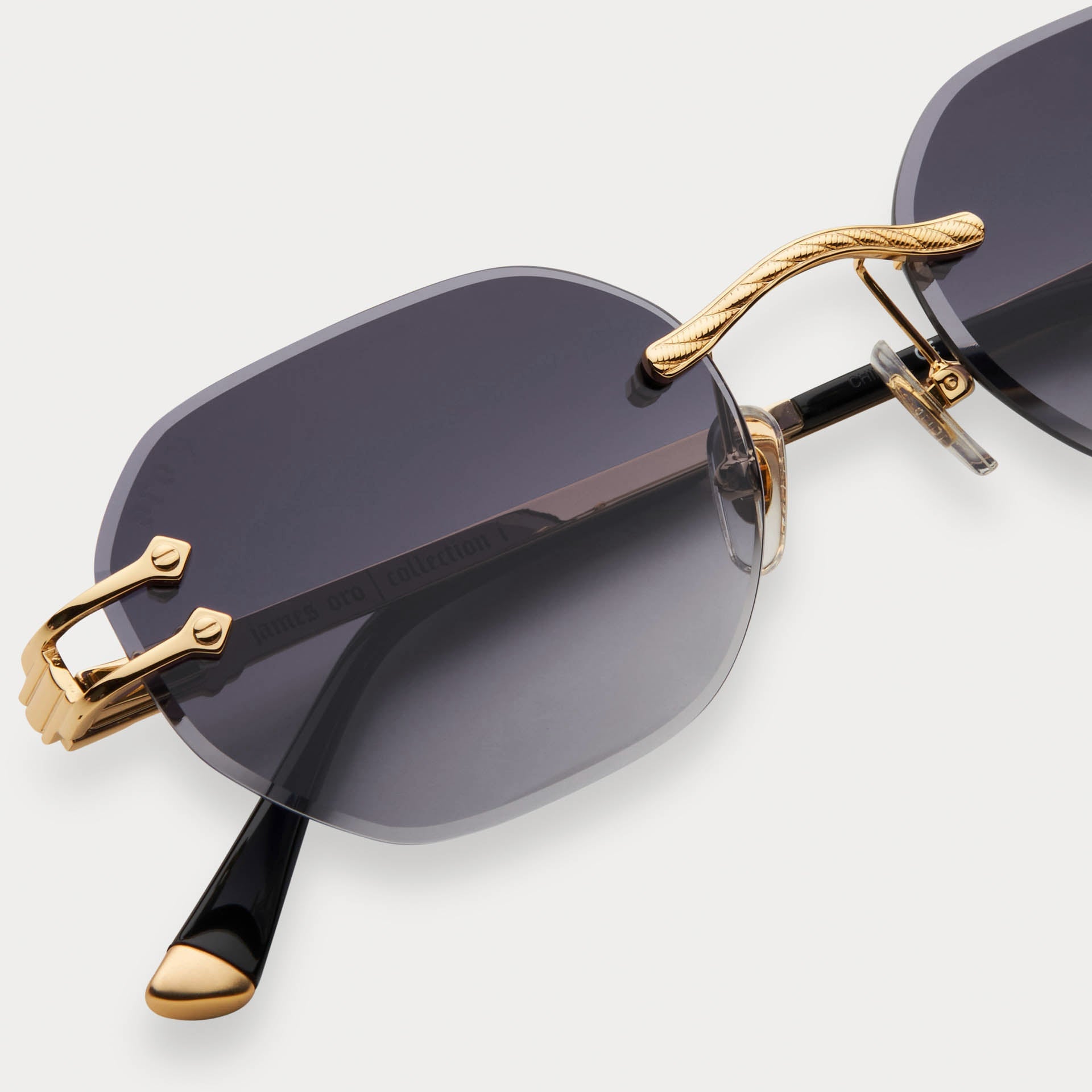 Luxe yet laid back. Crafted with a gracefully curved silhouette, the hexagonal rimless Opus by James Oro is distinguished by a “diamond” beveled-edge lens cut. Two-pronged lens drill mounts ensure abundant support, strength and longevity, while spring hinges provide comfort and ease of wear. Suited for a prescription lens or casual eyewear.