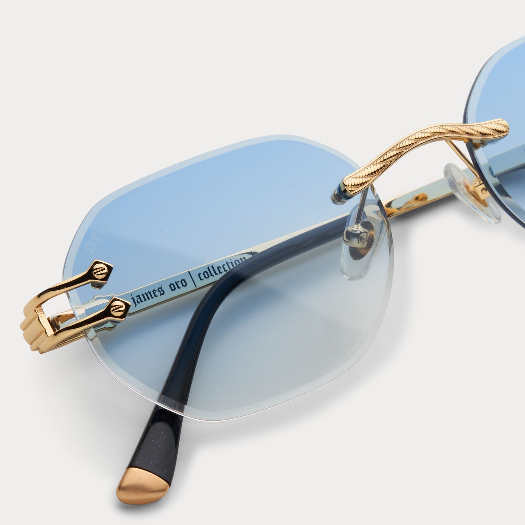 Luxe yet laid back. Crafted with a gracefully curved silhouette, the hexagonal rimless Opus by James Oro is distinguished by a “diamond” beveled-edge lens cut. Two-pronged lens drill mounts ensure abundant support, strength and longevity, while spring hinges provide comfort and ease of wear. Suited for a prescription lens or casual eyewear.