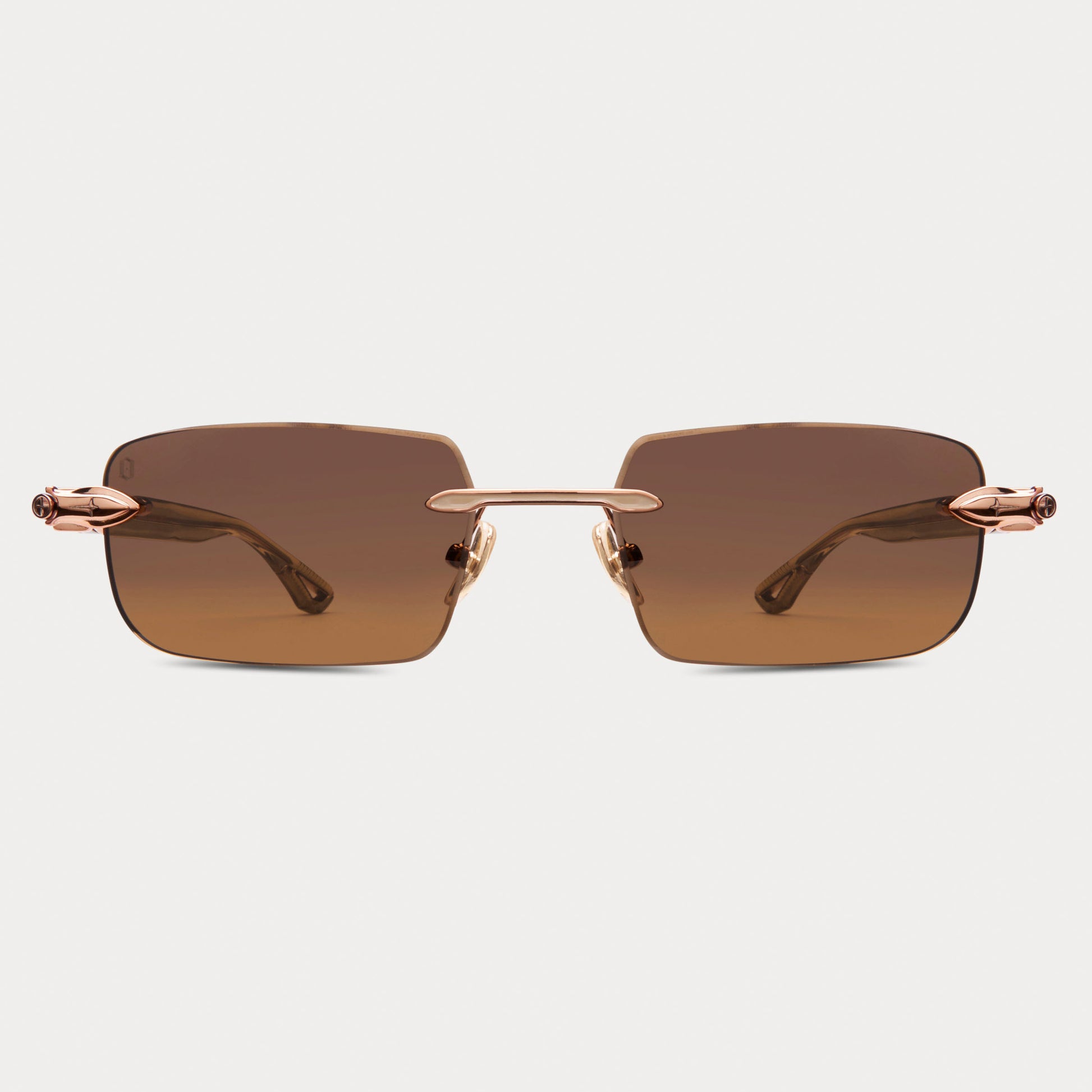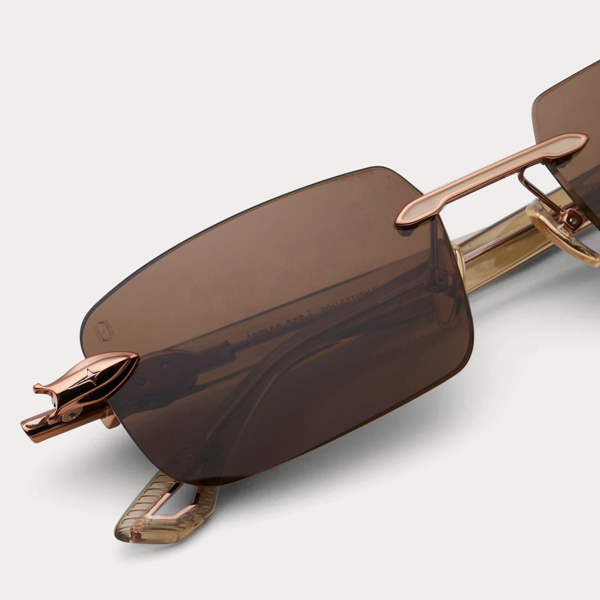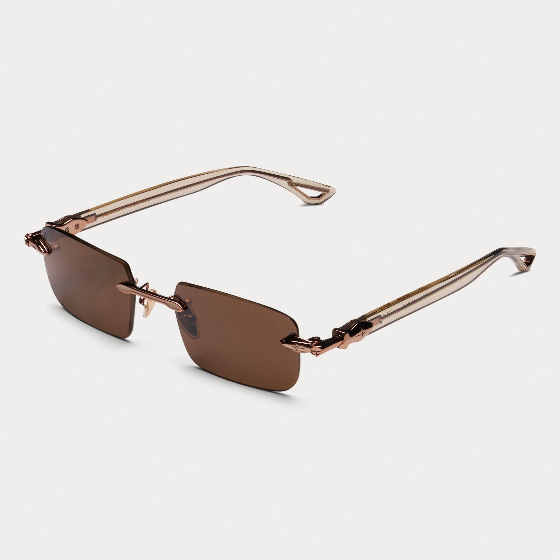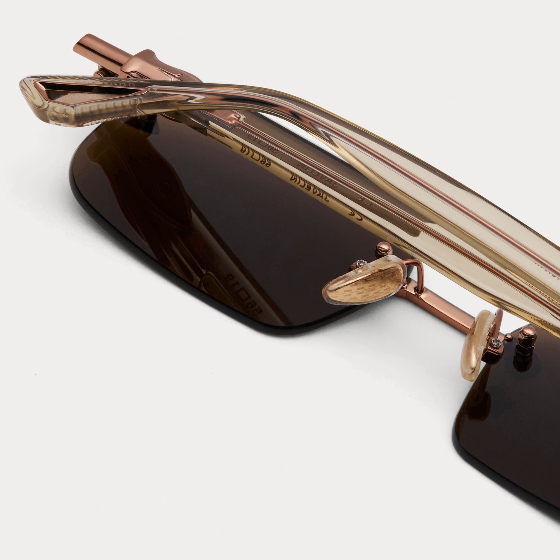 The Javelin combines champagne acetate, bronze metal, and dark brown lenses for a luxurious, lightweight frame with striking contrast.