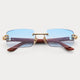 A sophisticated rimless frame with 100% genuine wood temples, featuring custom Oro-branded hieroglyphics engraved into the temples. Enhanced with stainless steel hardware and semi-beveled lenses for ultimate clarity and a refined touch of detail.
