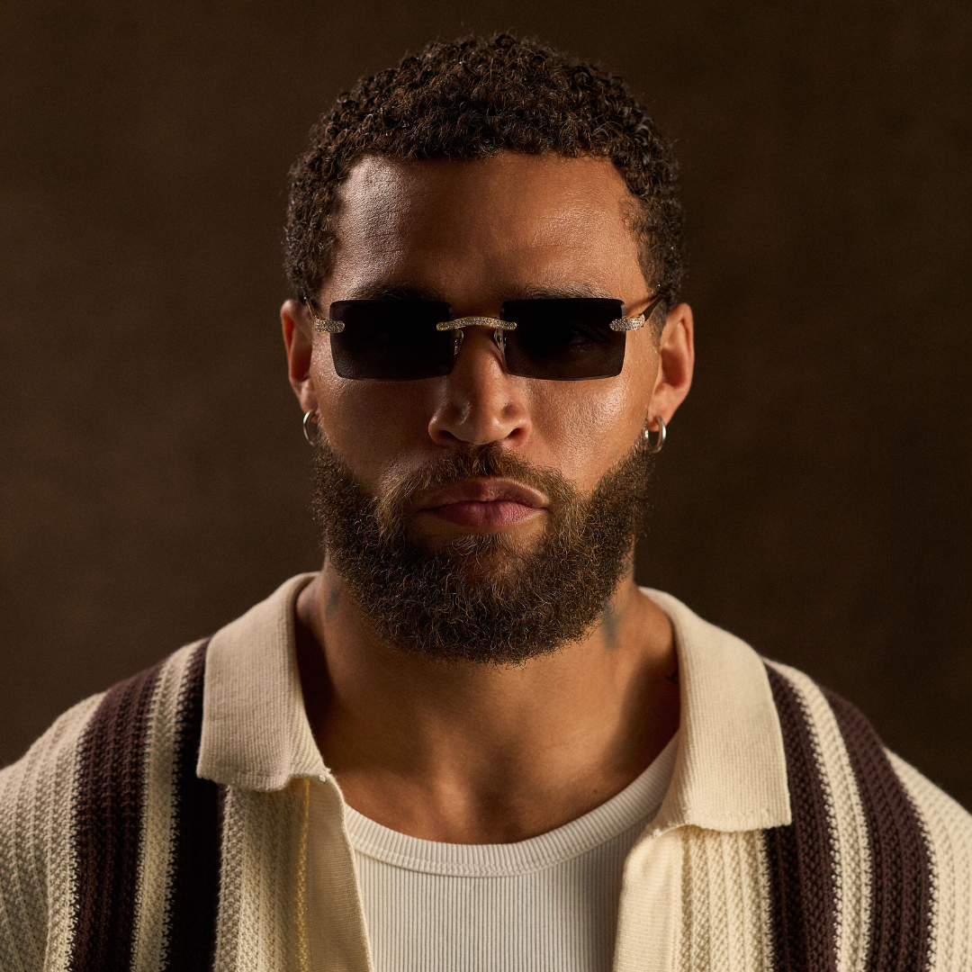 The frame that defined James Oro — now reimagined with a bold, brilliant edge. Its refined rectangular lenses and sleek metal chassis meet the radiance of precision-set cubic zirconia, designed to catch light from every angle.