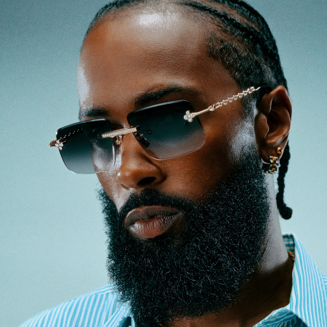 Fortune is a bold statement of luck and luxury, featuring large handset moissanite stones, four-leaf clover temple mounts, and chain-link temples for a daringly opulent finish.