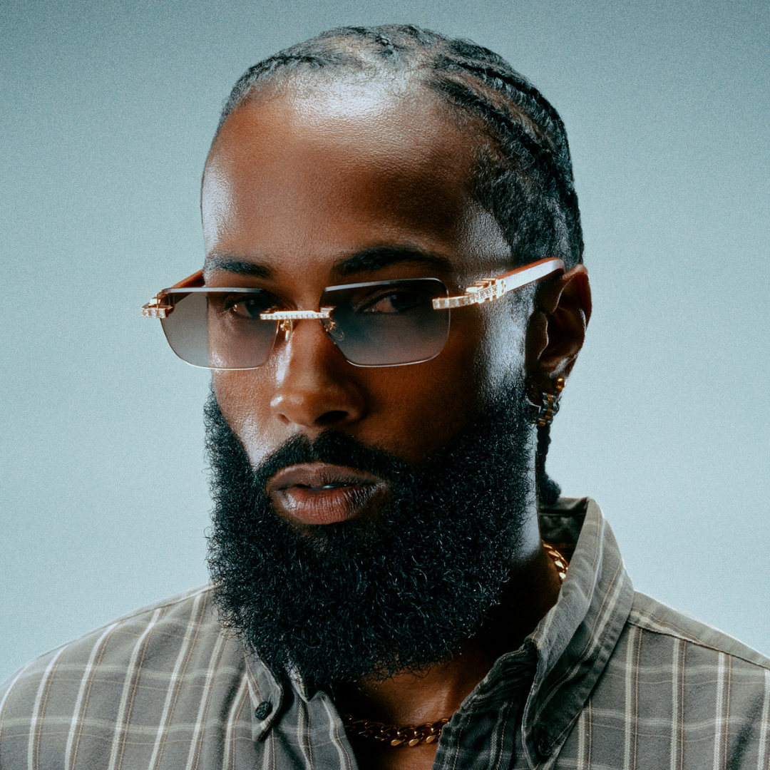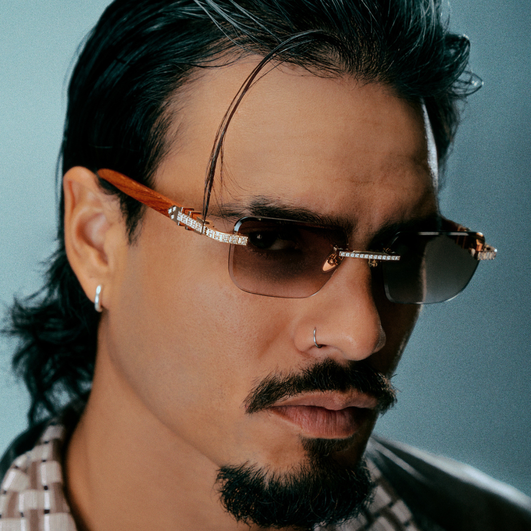 Bankroller is rimless luxury at its peak—alternating handset moissanite stones and rich wooden temples forge a bold rectangular silhouette made for true shot callers.