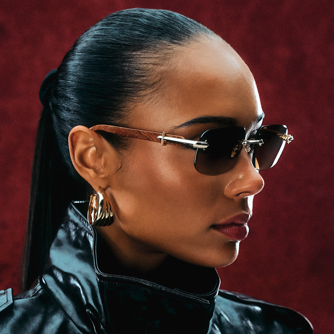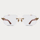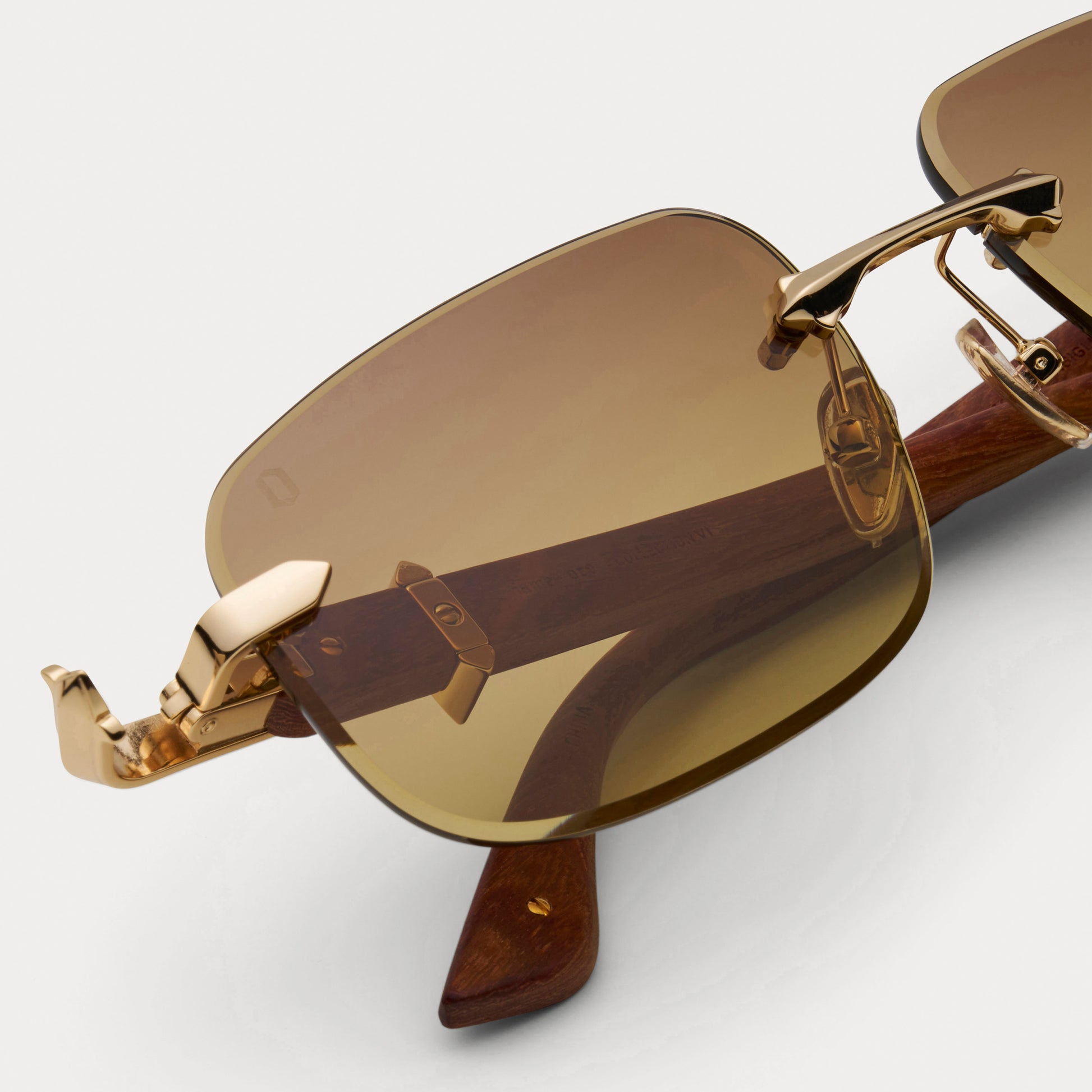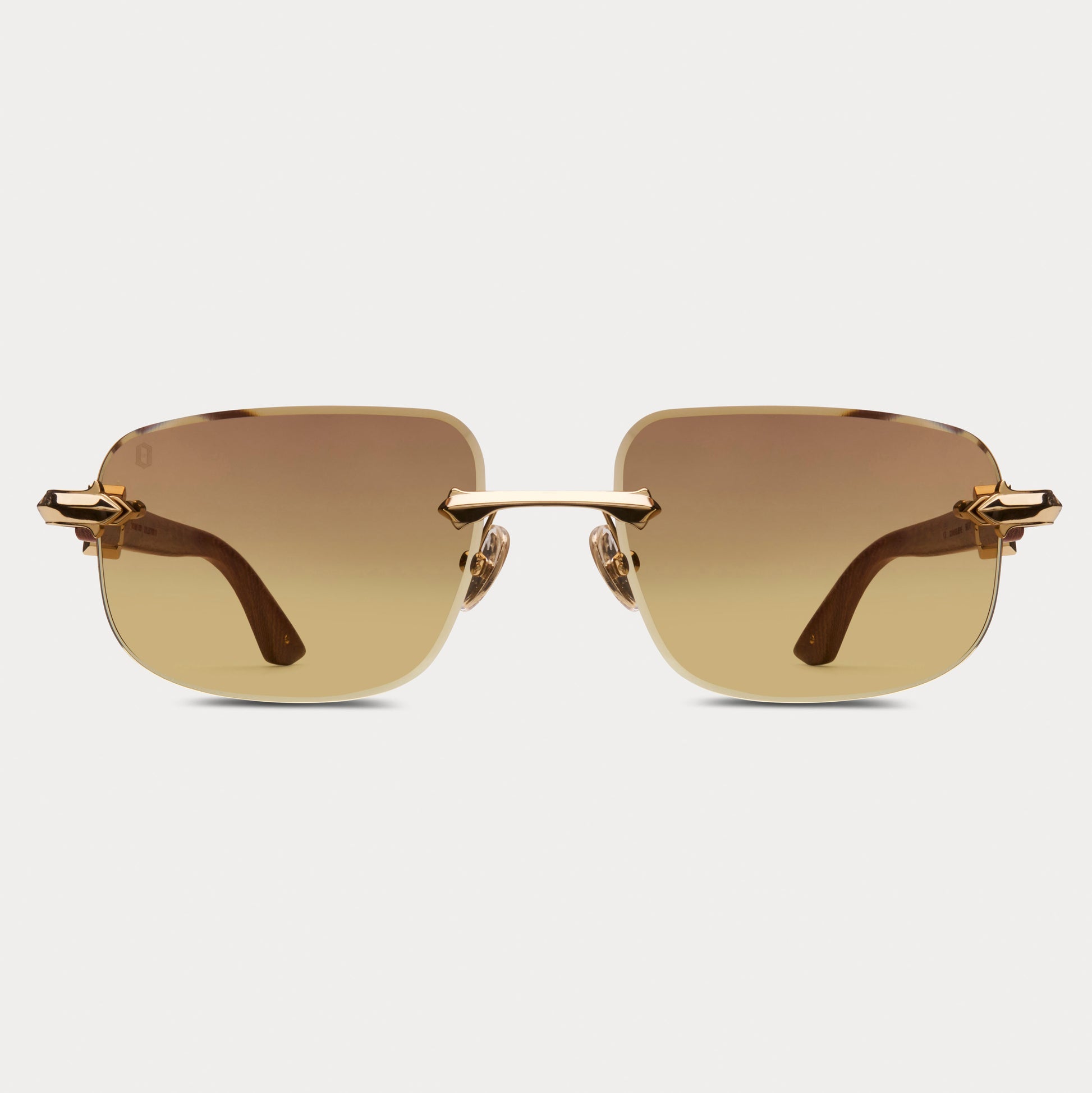 The Consigliere is an aviator rimless frame with a luxurious wood and gold treatment, paired with faceted details inspired Victorian era accents creates a frame of old opulence with a modern twist.