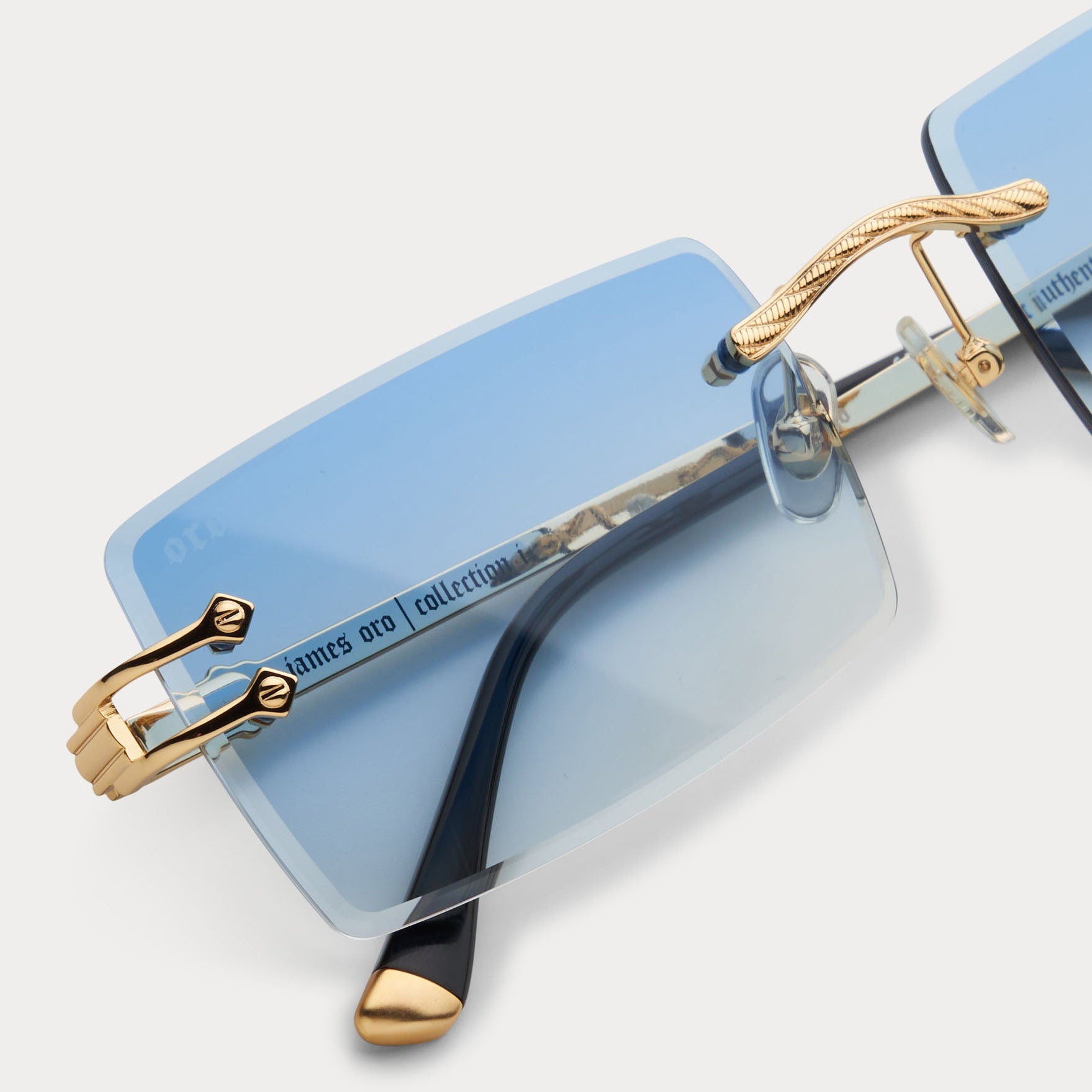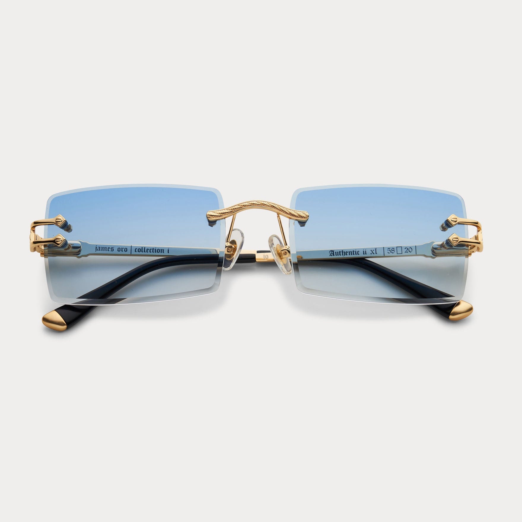 Meet a modern classic: An iconic rectangular rimless frame, the sleek Authentic II by James Oro comprises our signature "diamond" bevel-edge lens cut and logo-embossed tips. The frame is designed in 18KT gold or silver dipped iterations, and each temple is adorned with rope chain and logo details.