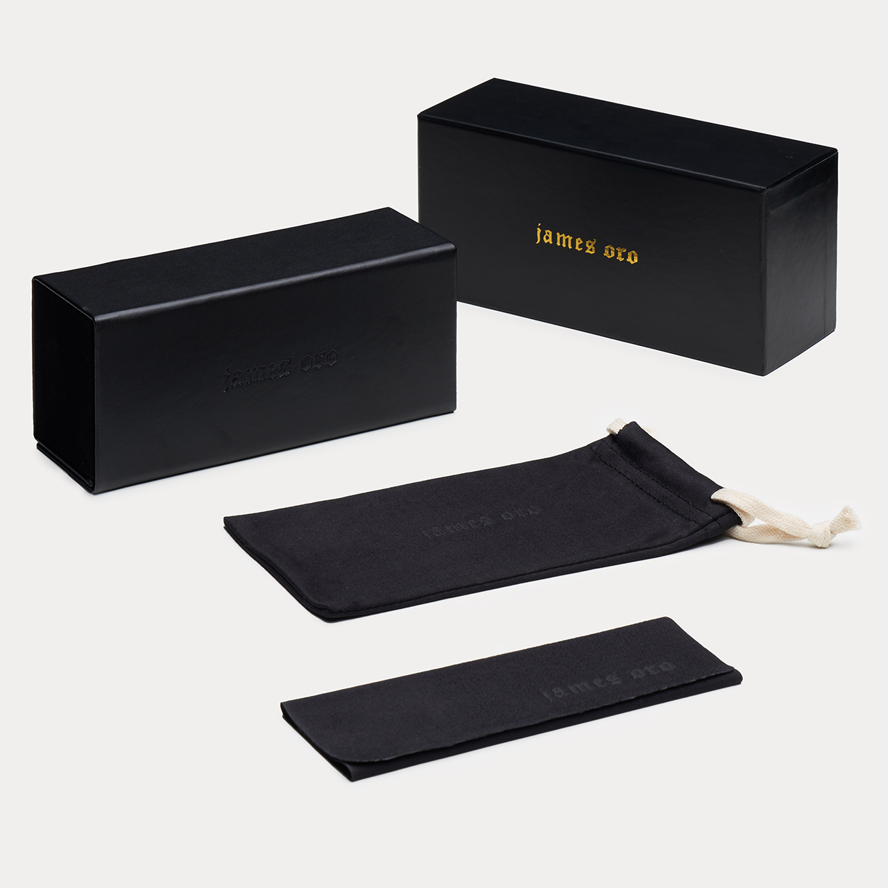 Elevating your experience, each meticulously handcrafted James Oro frame arrives with a complimentary matte black box, faux leather foldable case, drawstring cloth pouch, and logo-embossed cleaning cloth. This exquisite packaging holds not only your eyewear but also includes a 1-year warranty and certification card, ensuring your confidence in the lasting beauty and durability of our creations.