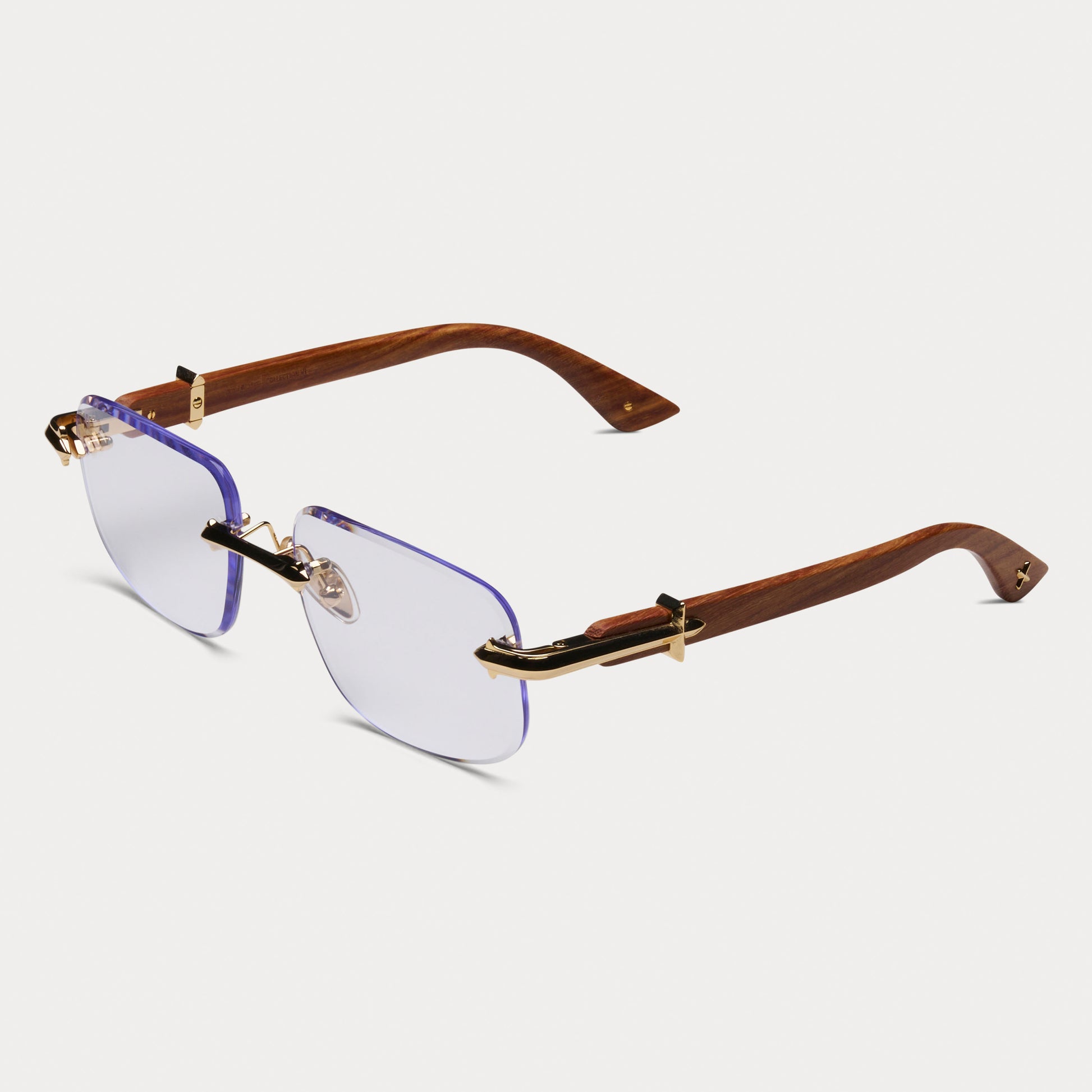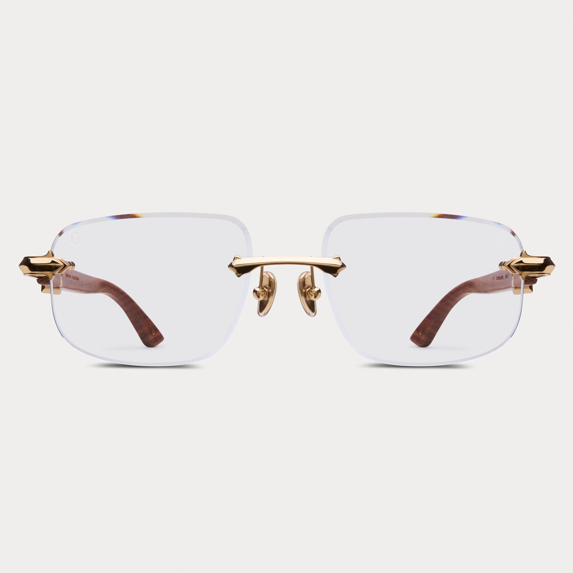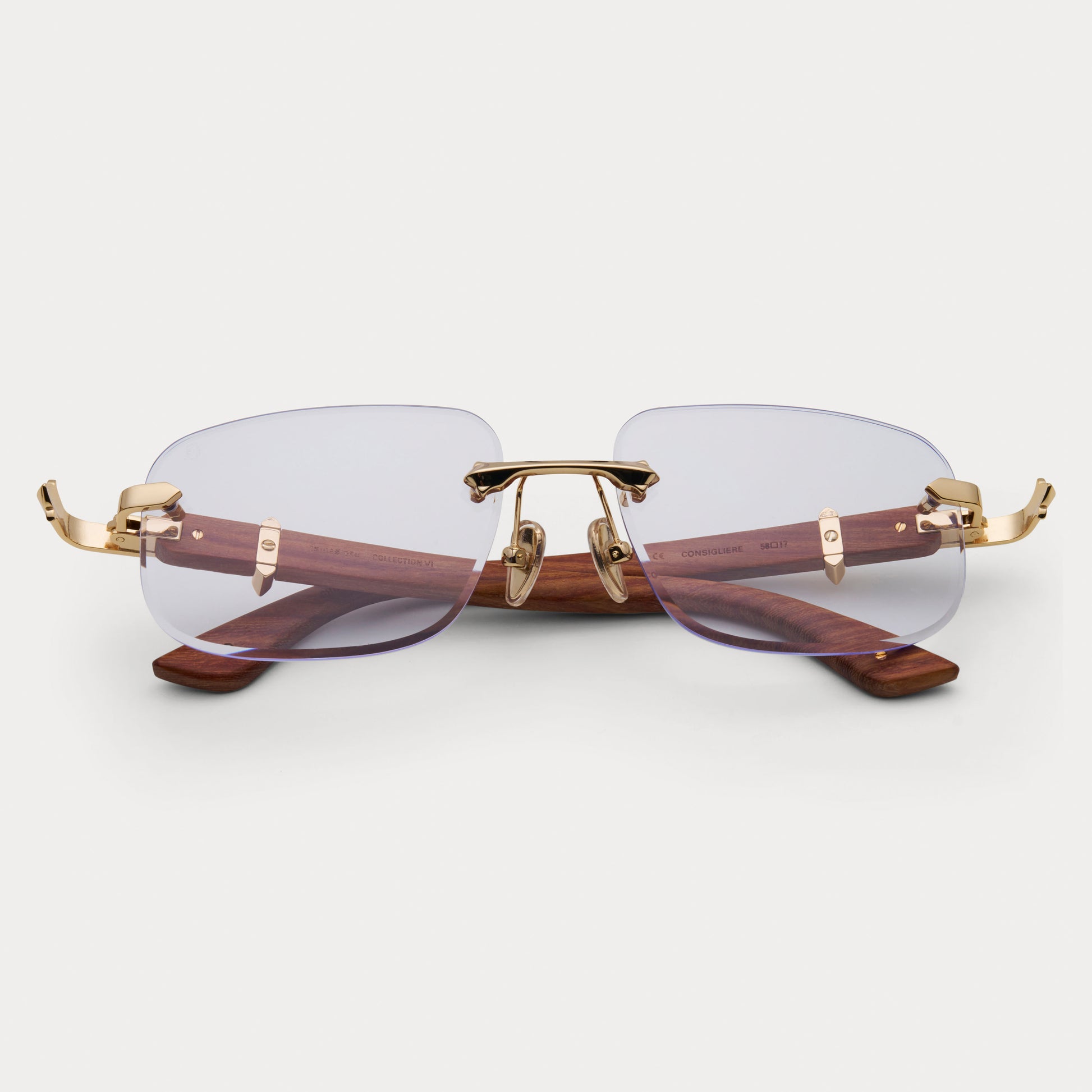 The Consigliere is an aviator rimless frame with a luxurious wood and gold treatment, paired with faceted details inspired Victorian era accents creates a frame of old opulence with a modern twist.