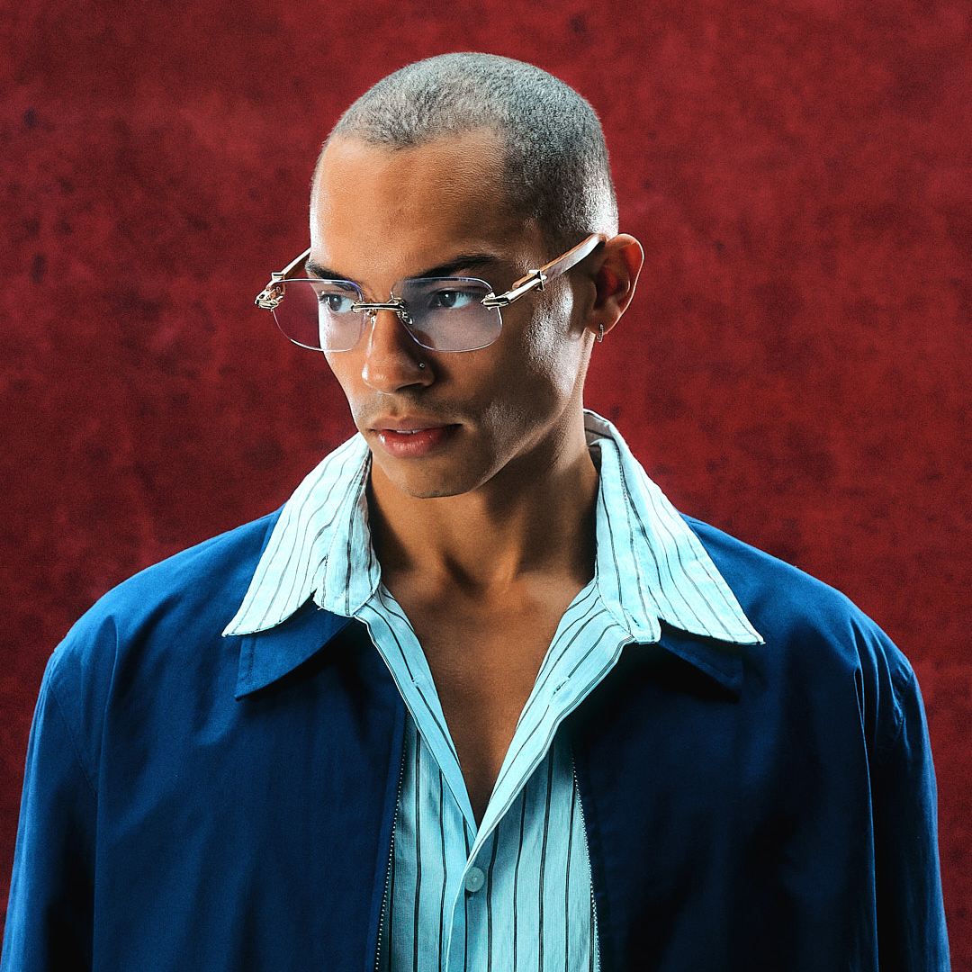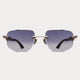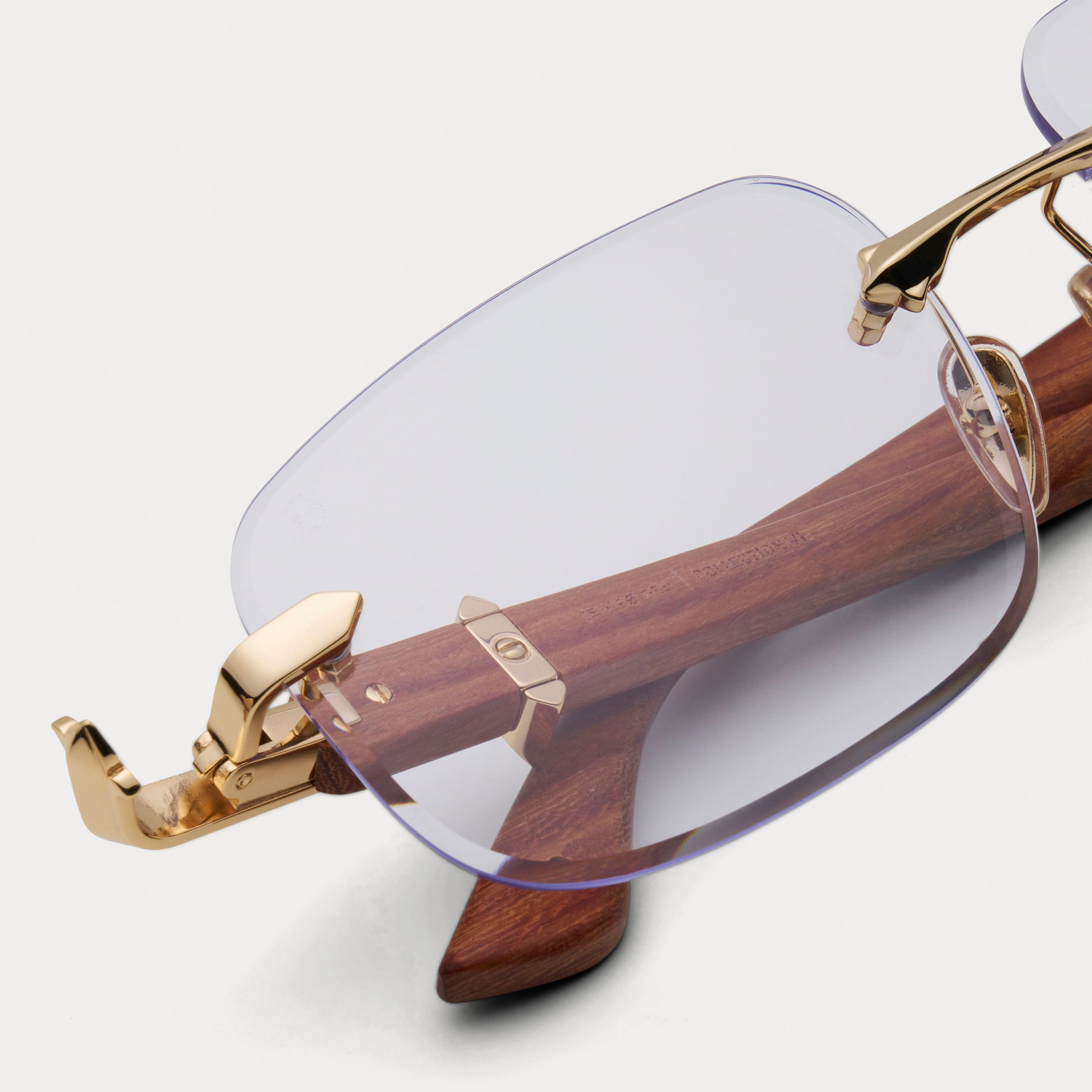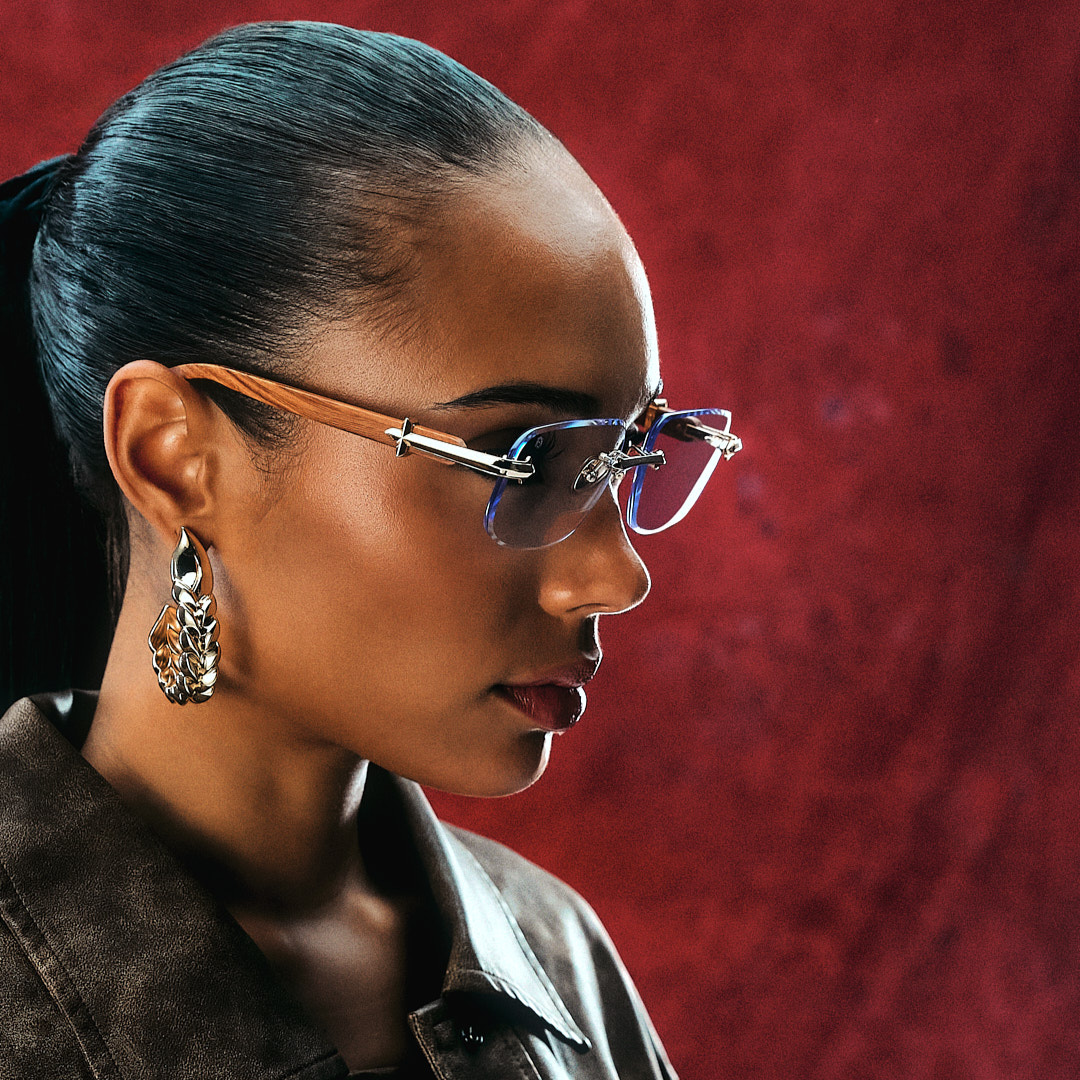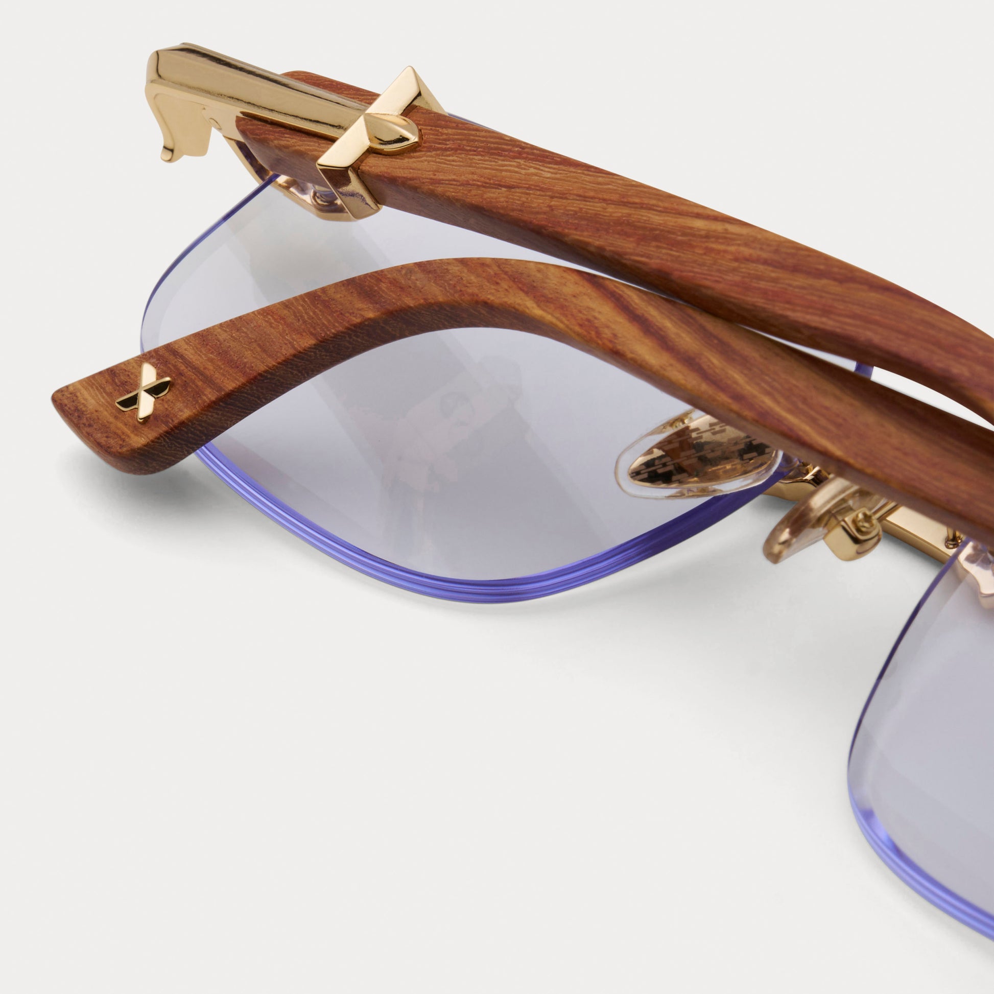 The Consigliere is an aviator rimless frame with a luxurious wood and gold treatment, paired with faceted details inspired Victorian era accents creates a frame of old opulence with a modern twist.