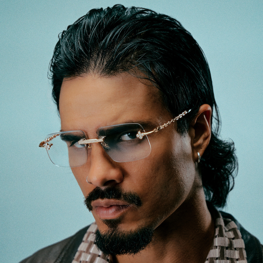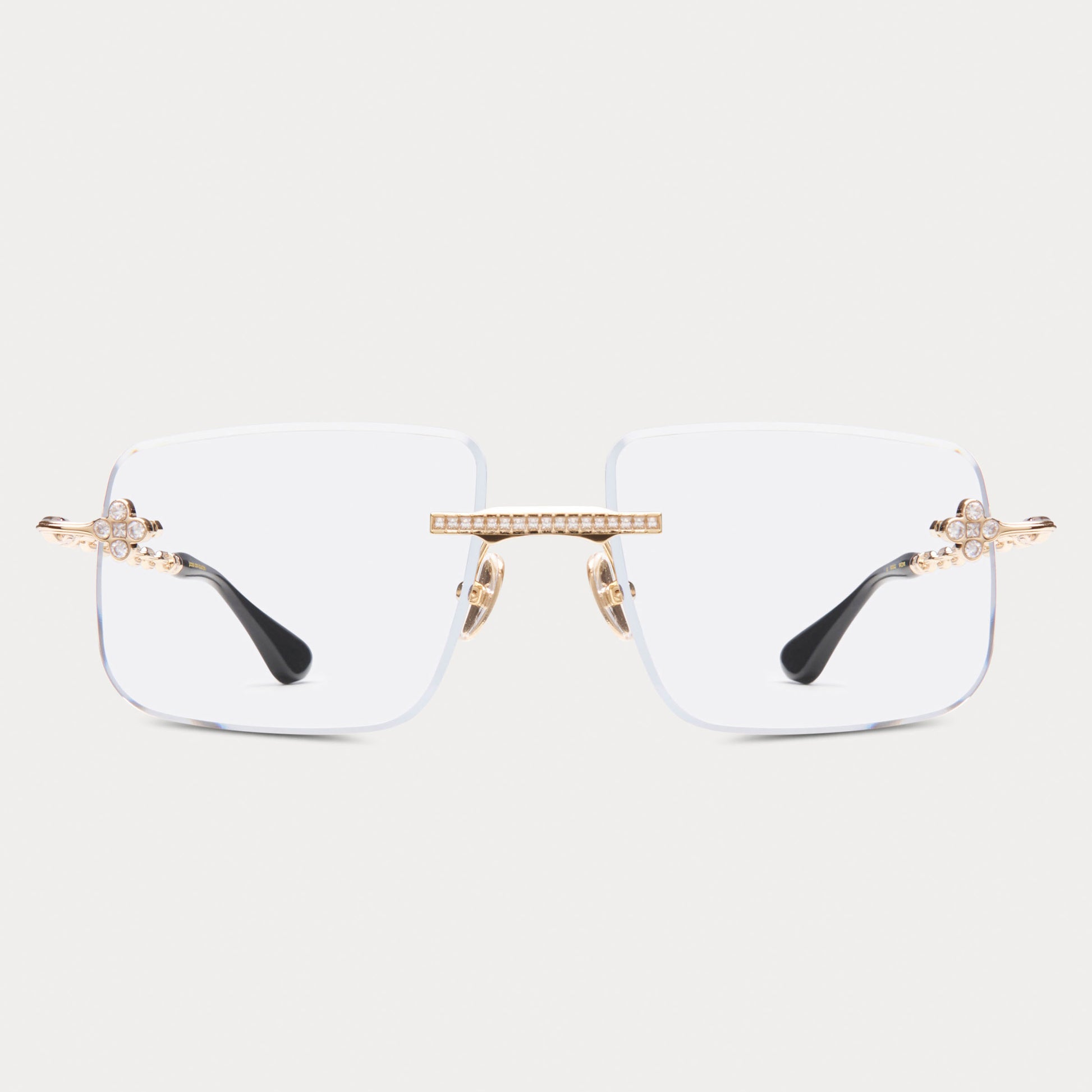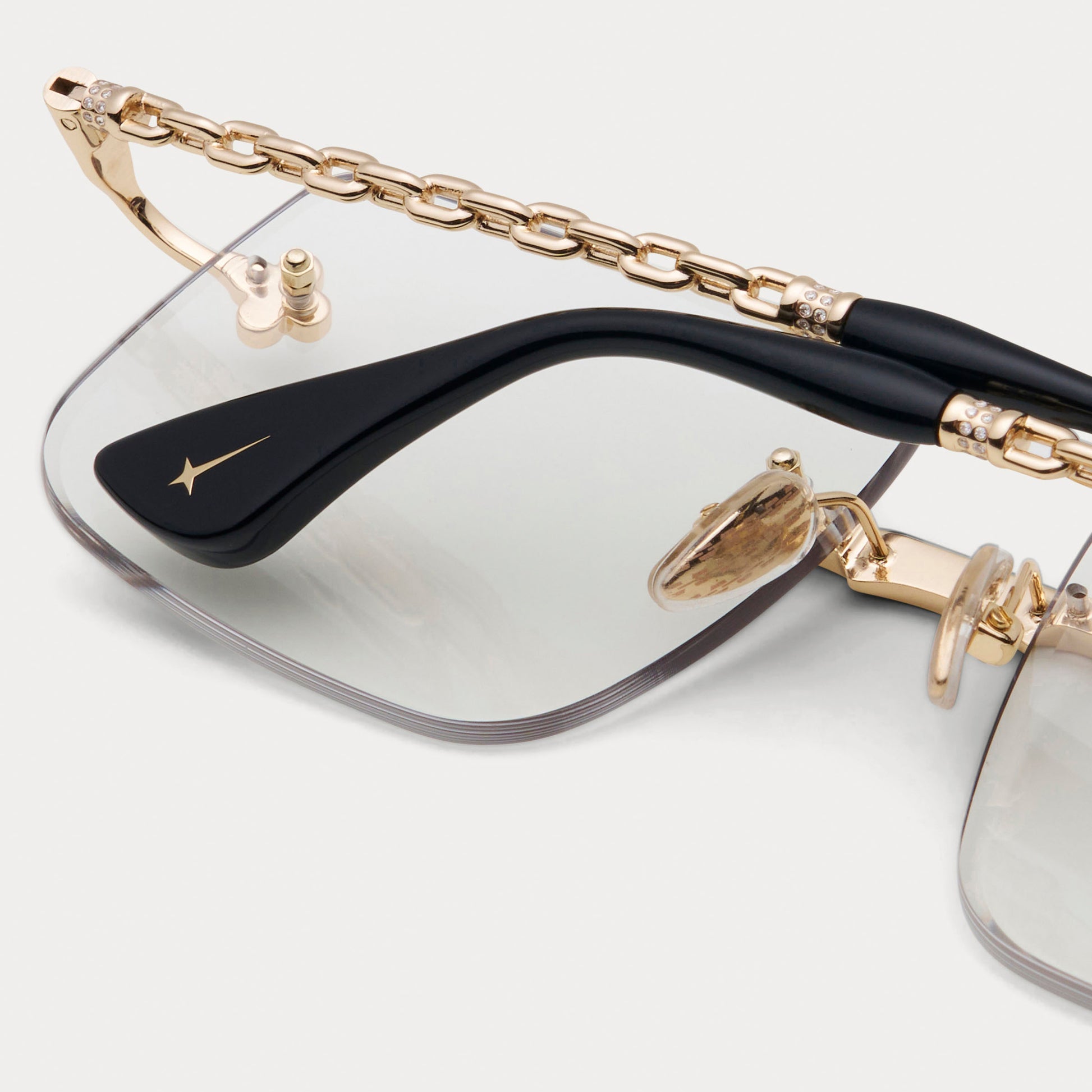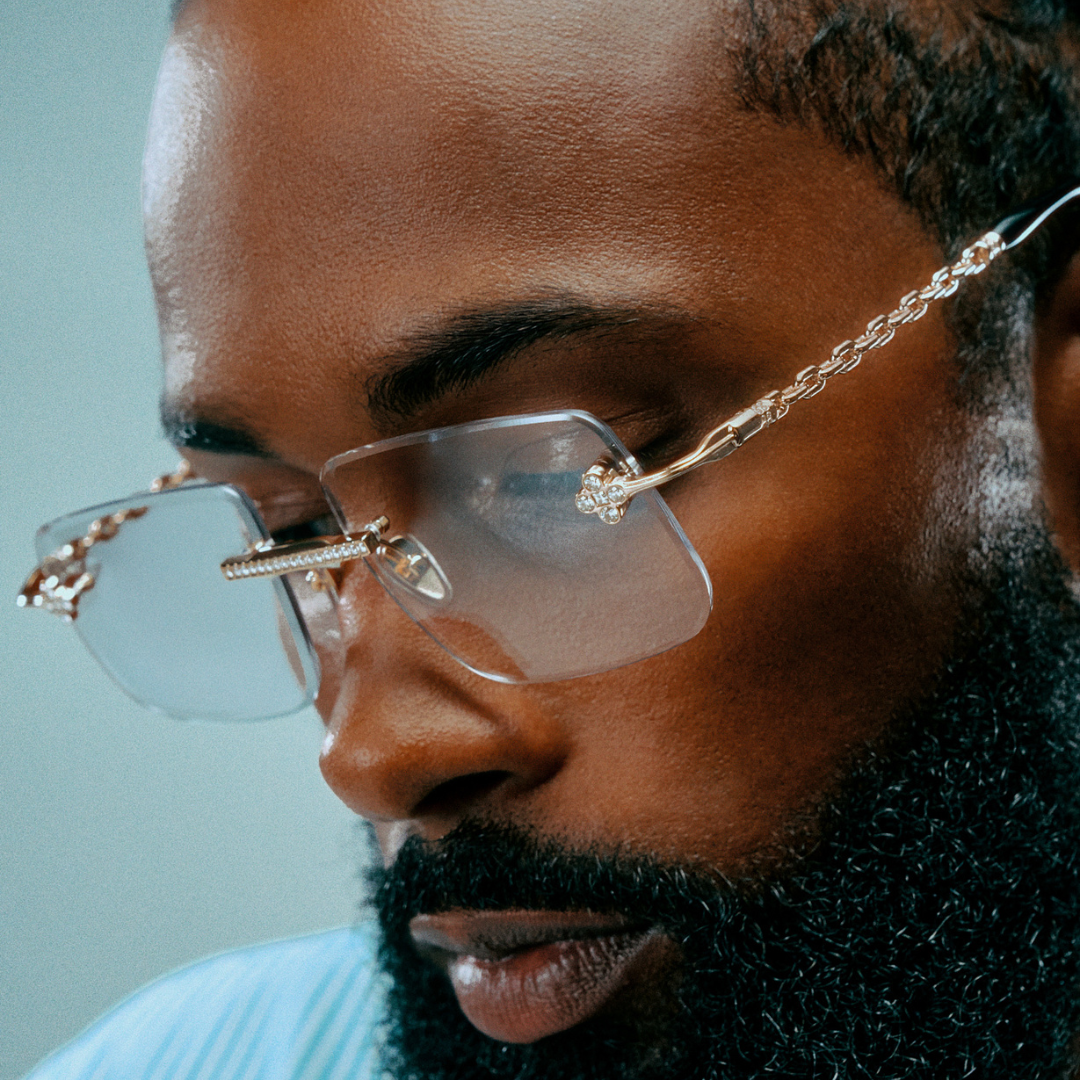 Fortune is a bold statement of luck and luxury, featuring large handset moissanite stones, four-leaf clover temple mounts, and chain-link temples for a daringly opulent finish.