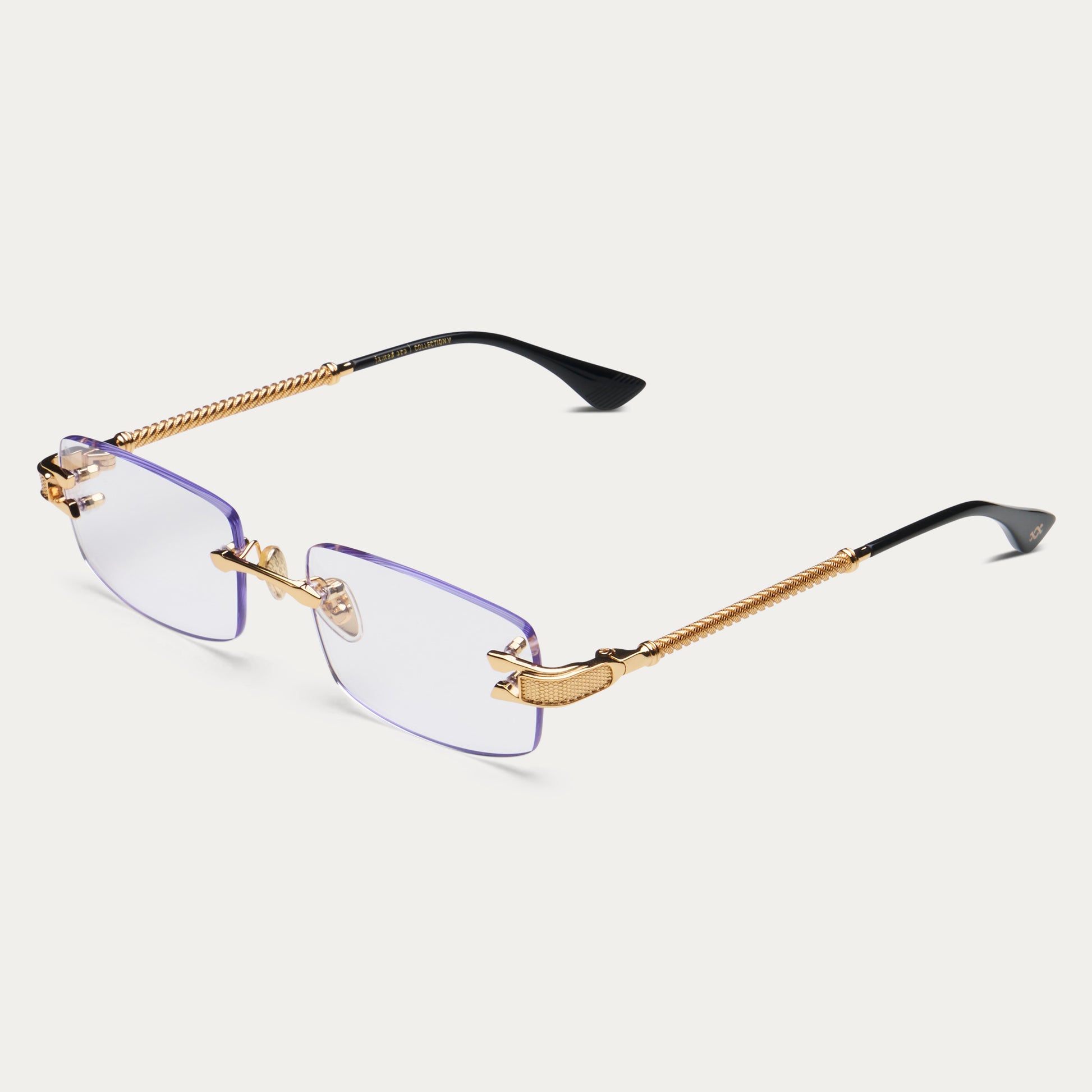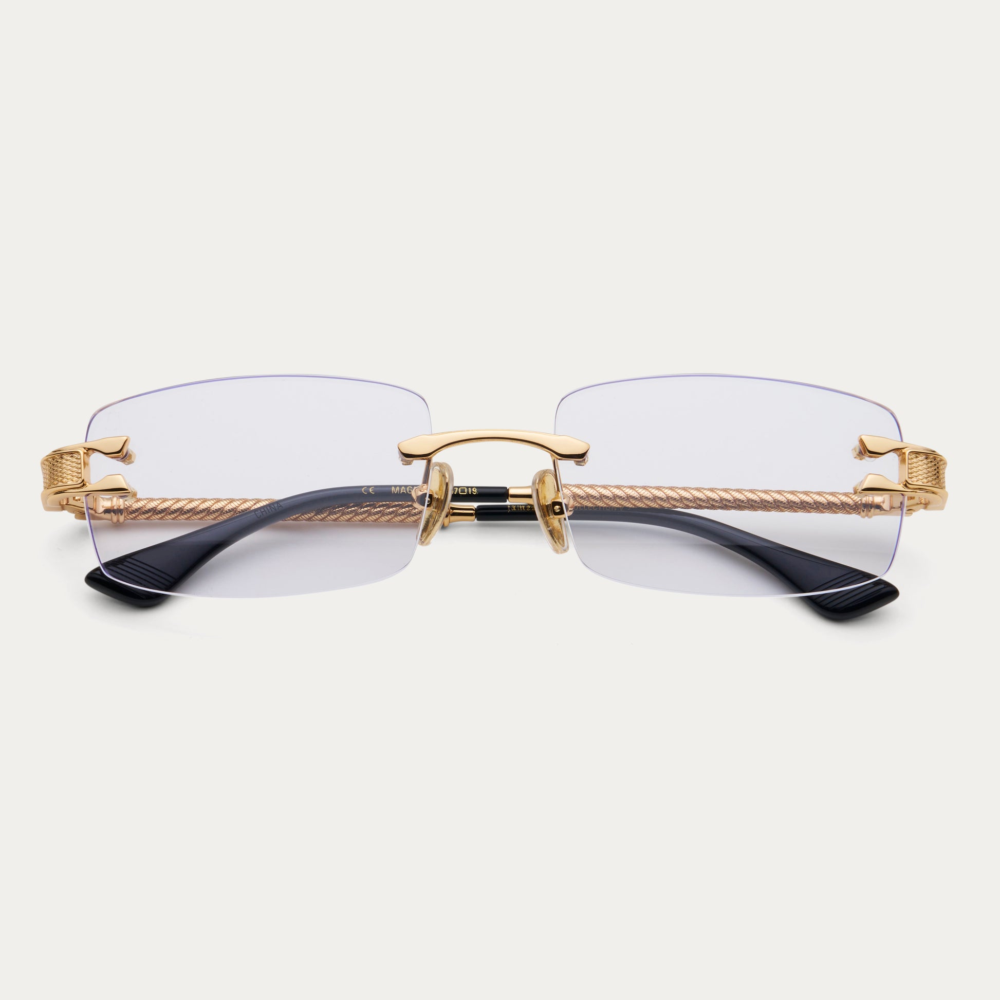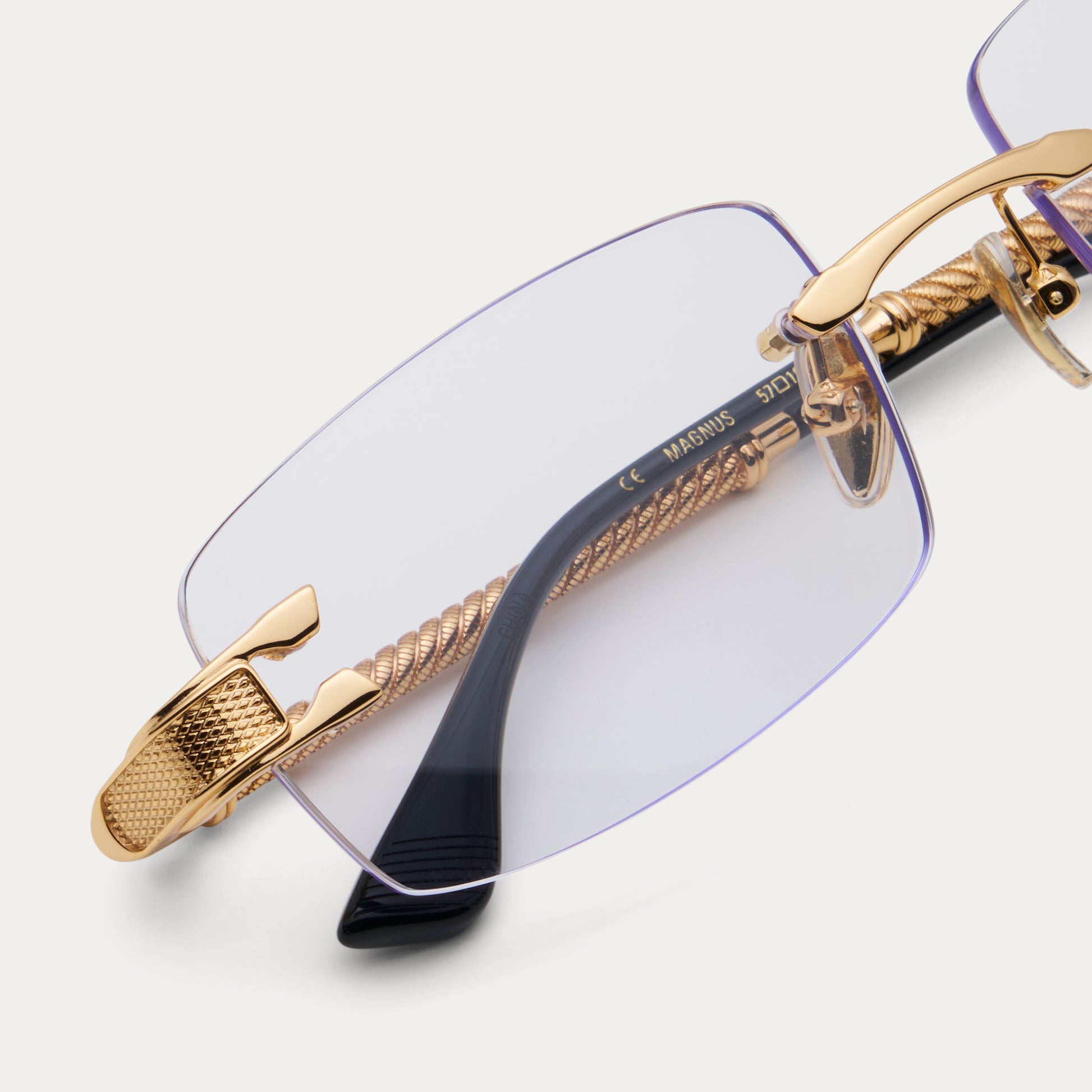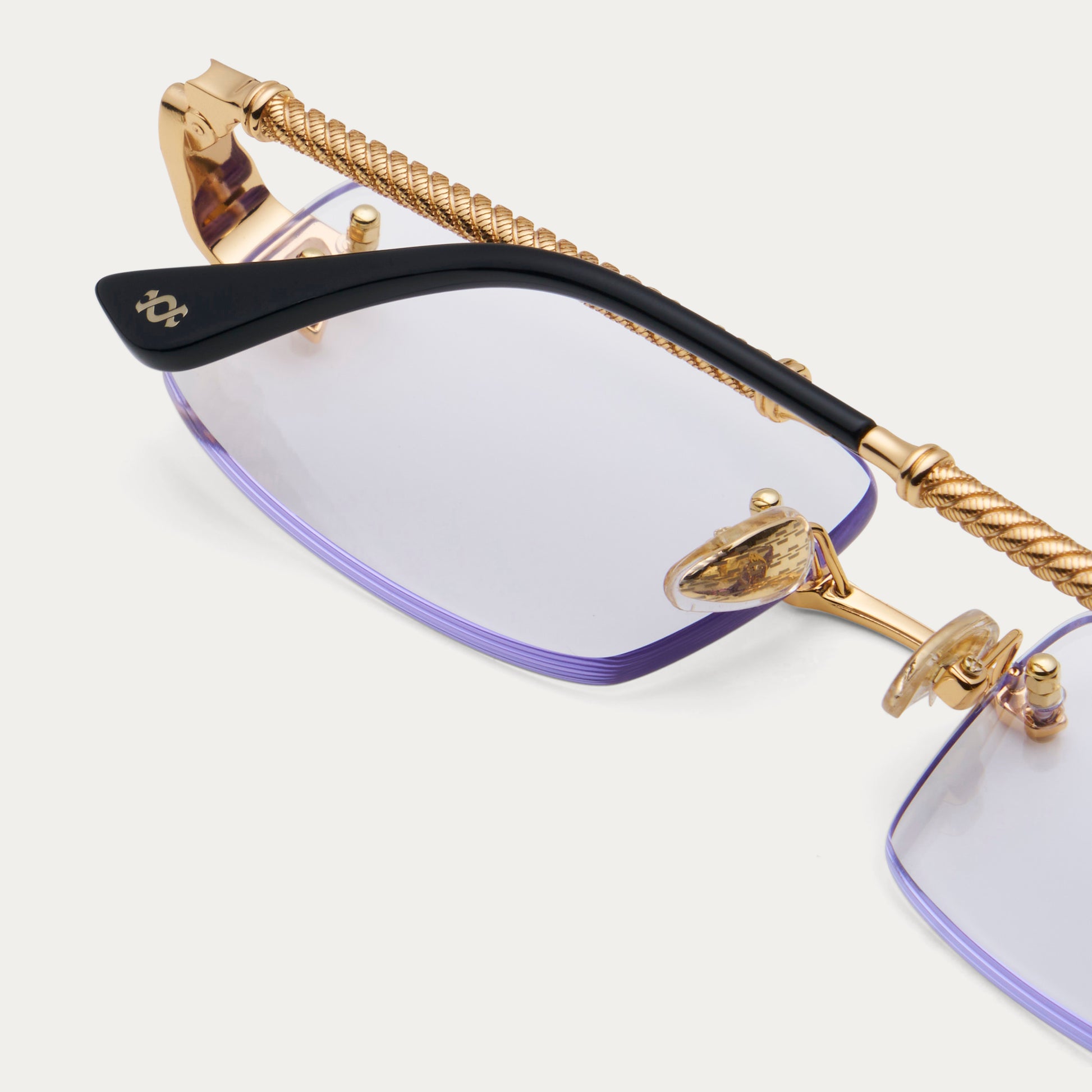 A bold statement frame featuring thick gold braided rope temples, custom knurling embossed lens mounts, and Oroboros metal emblem temple tips. Designed with extra wide 57mm lenses and Oro Link soft temple tips for ultimate comfort and style.
