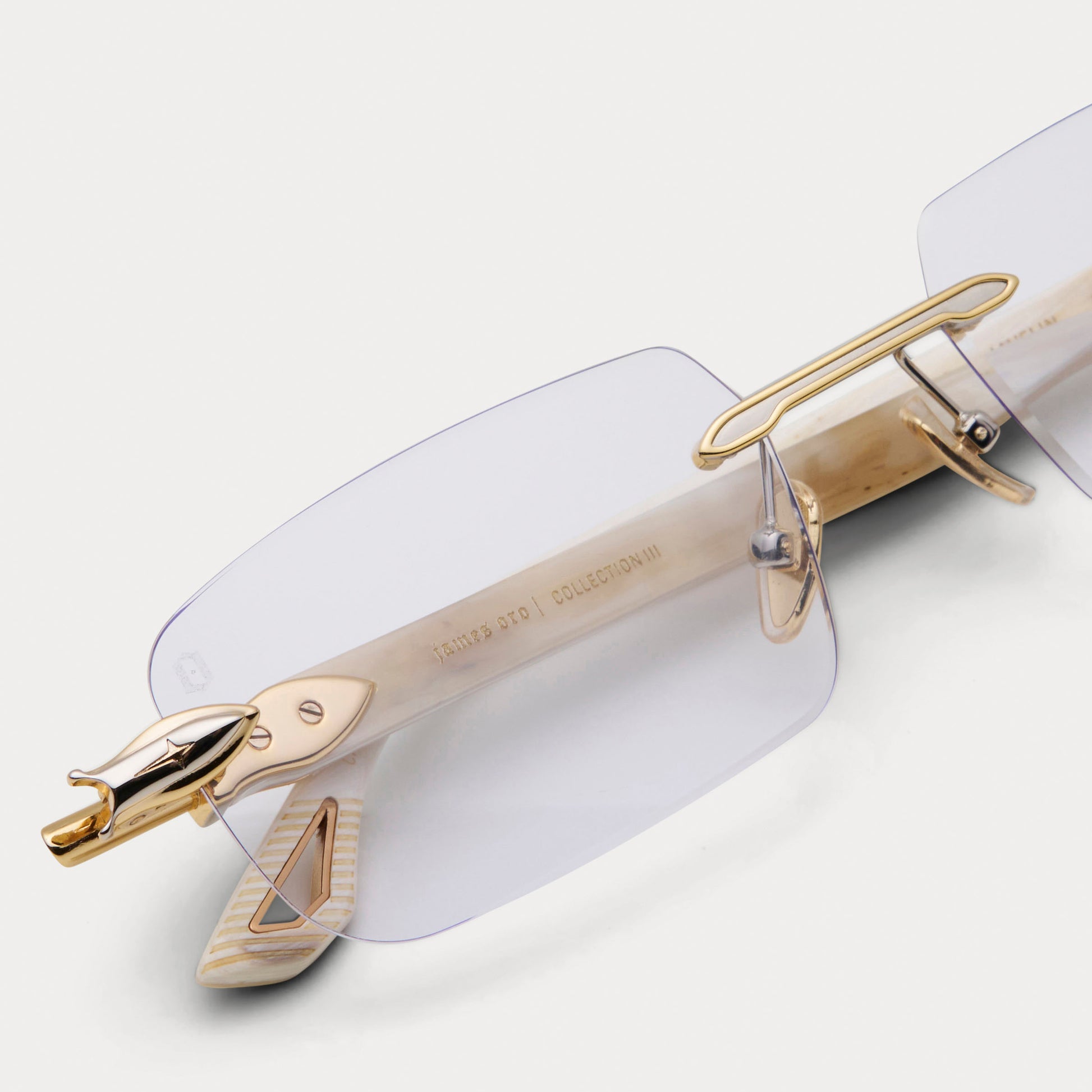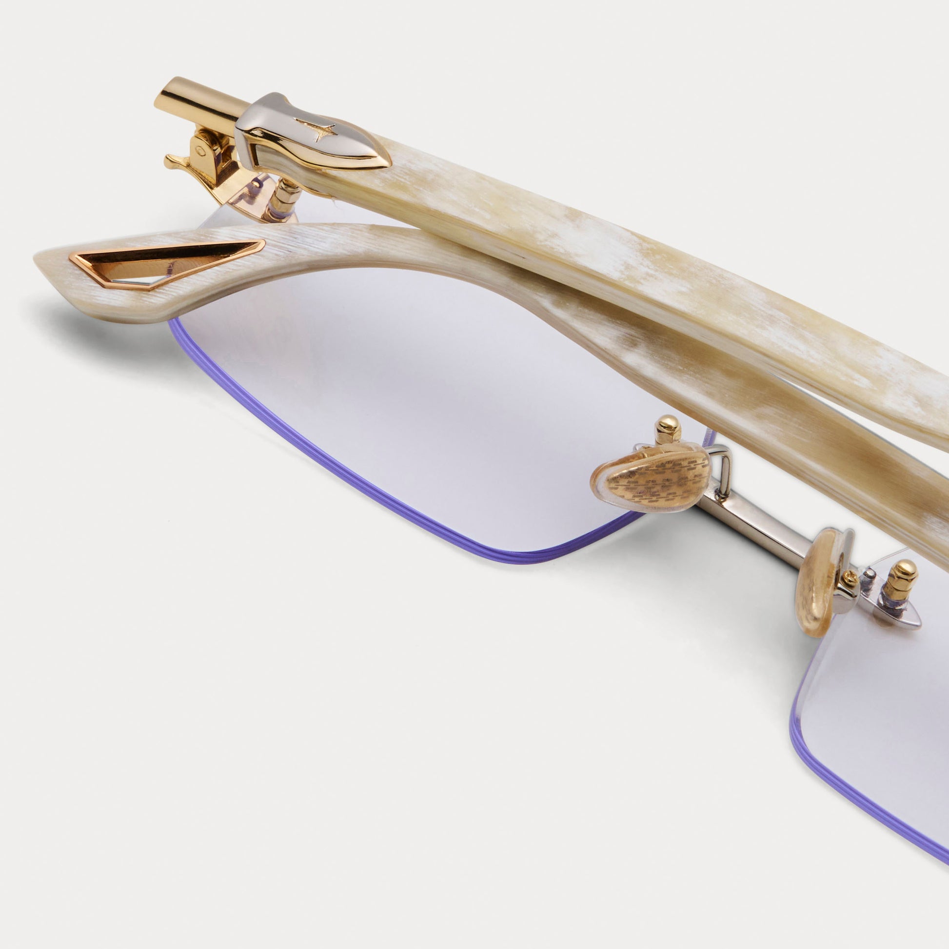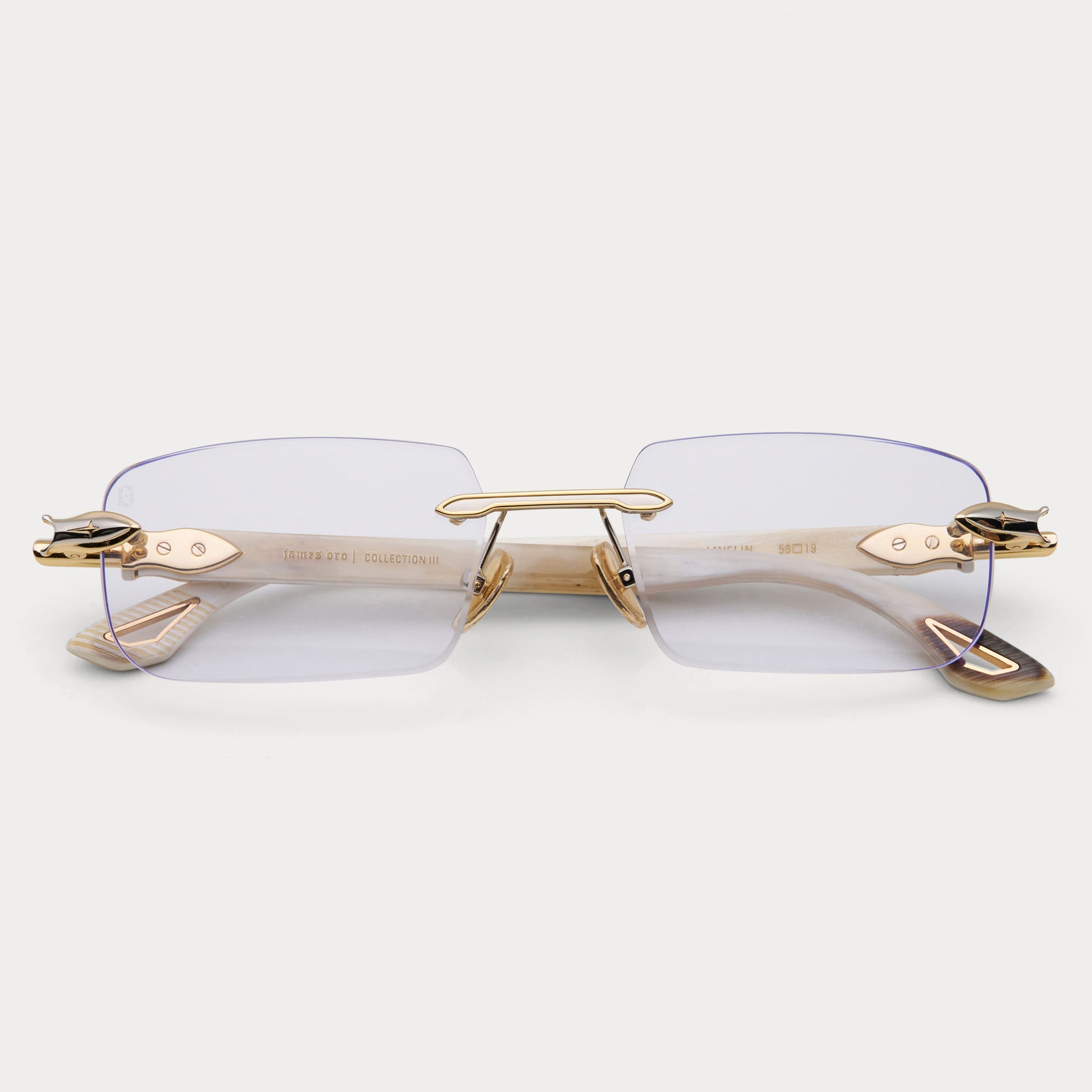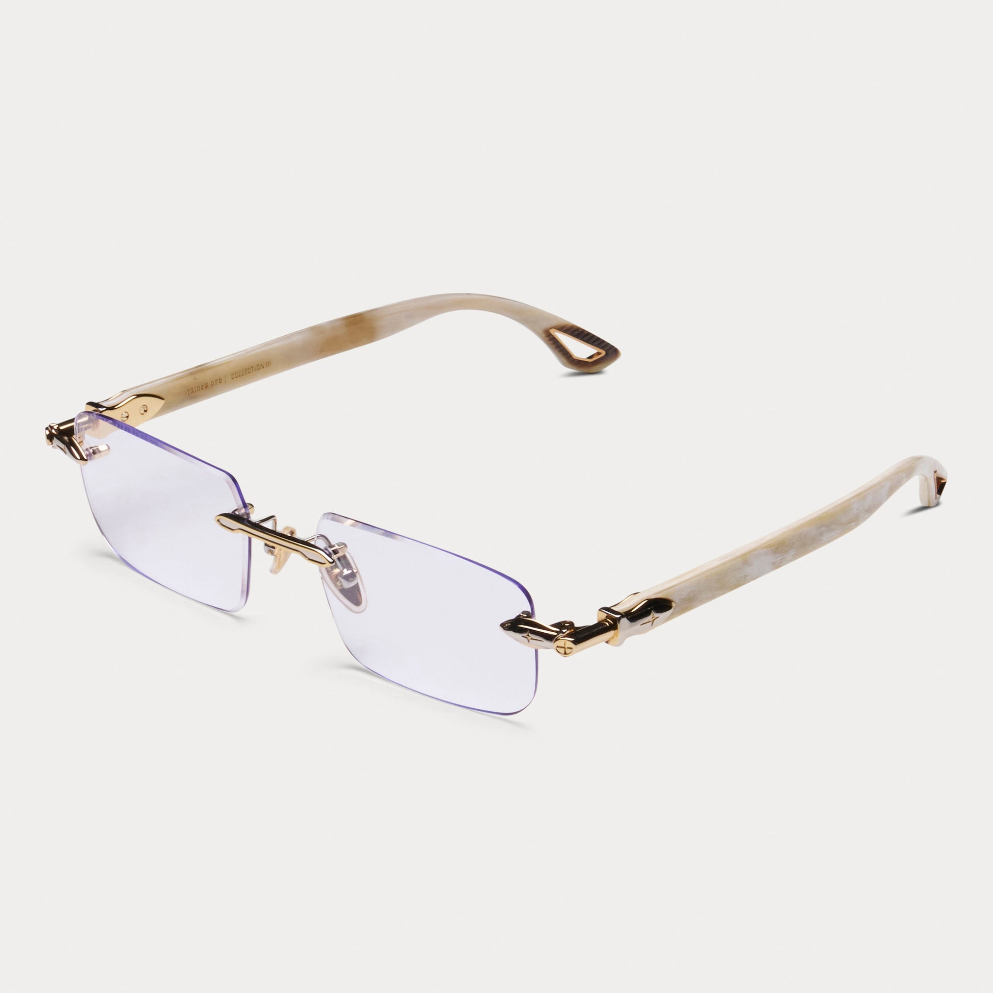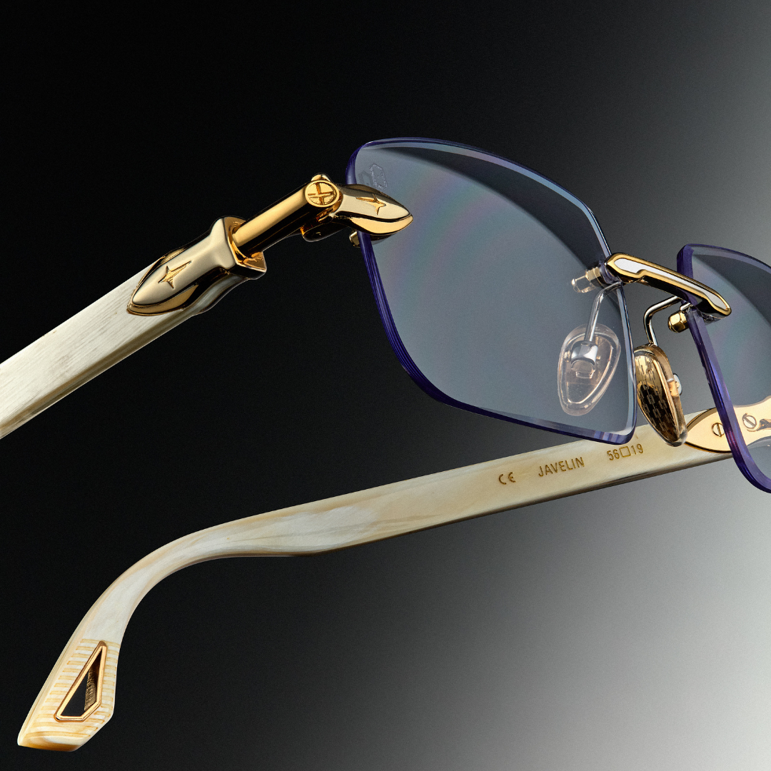 The Javelin showcases rare white buffalo horn with clear lenses and a gold-and-silver two-tone finish. Every temple is unique, making each frame one-of-a-kind.