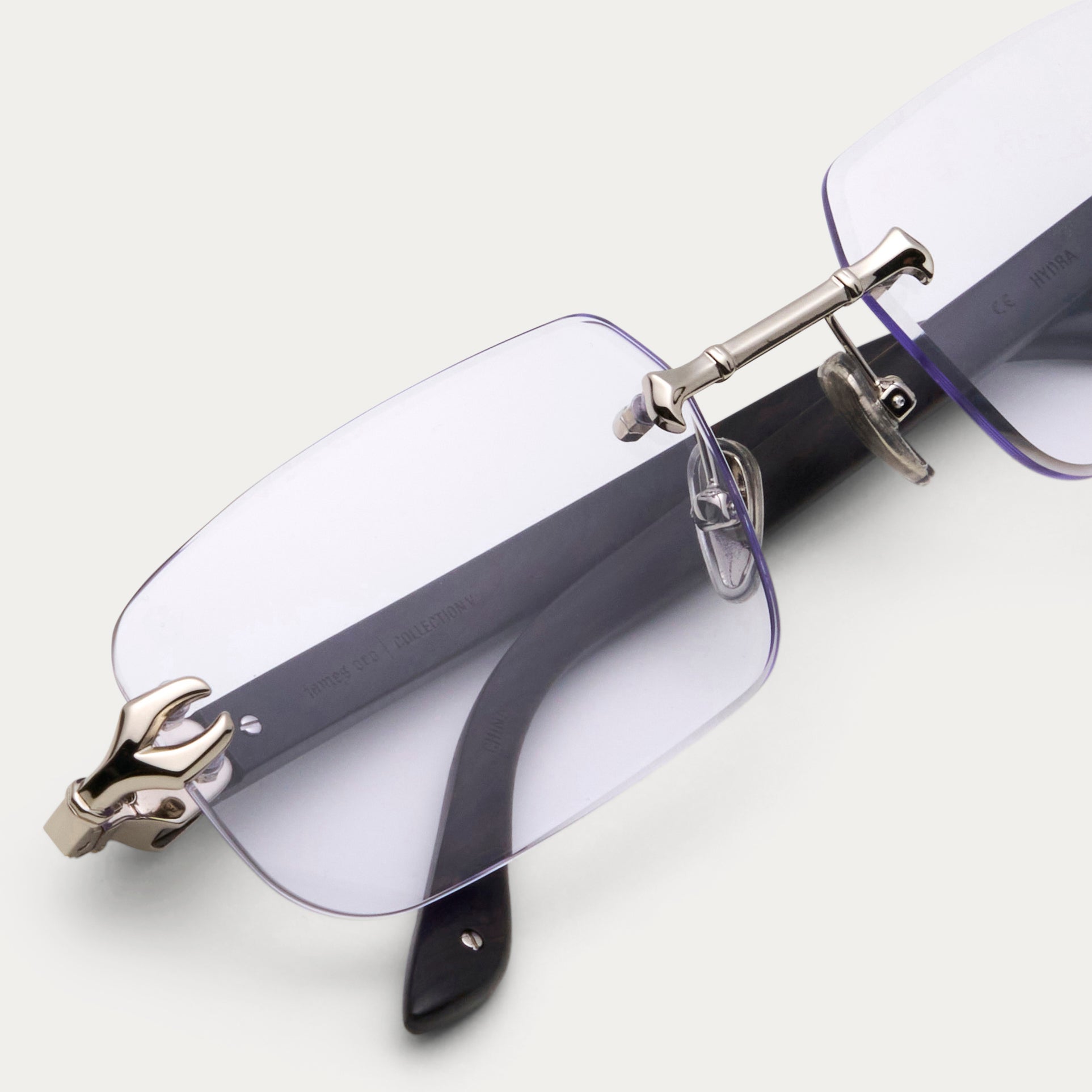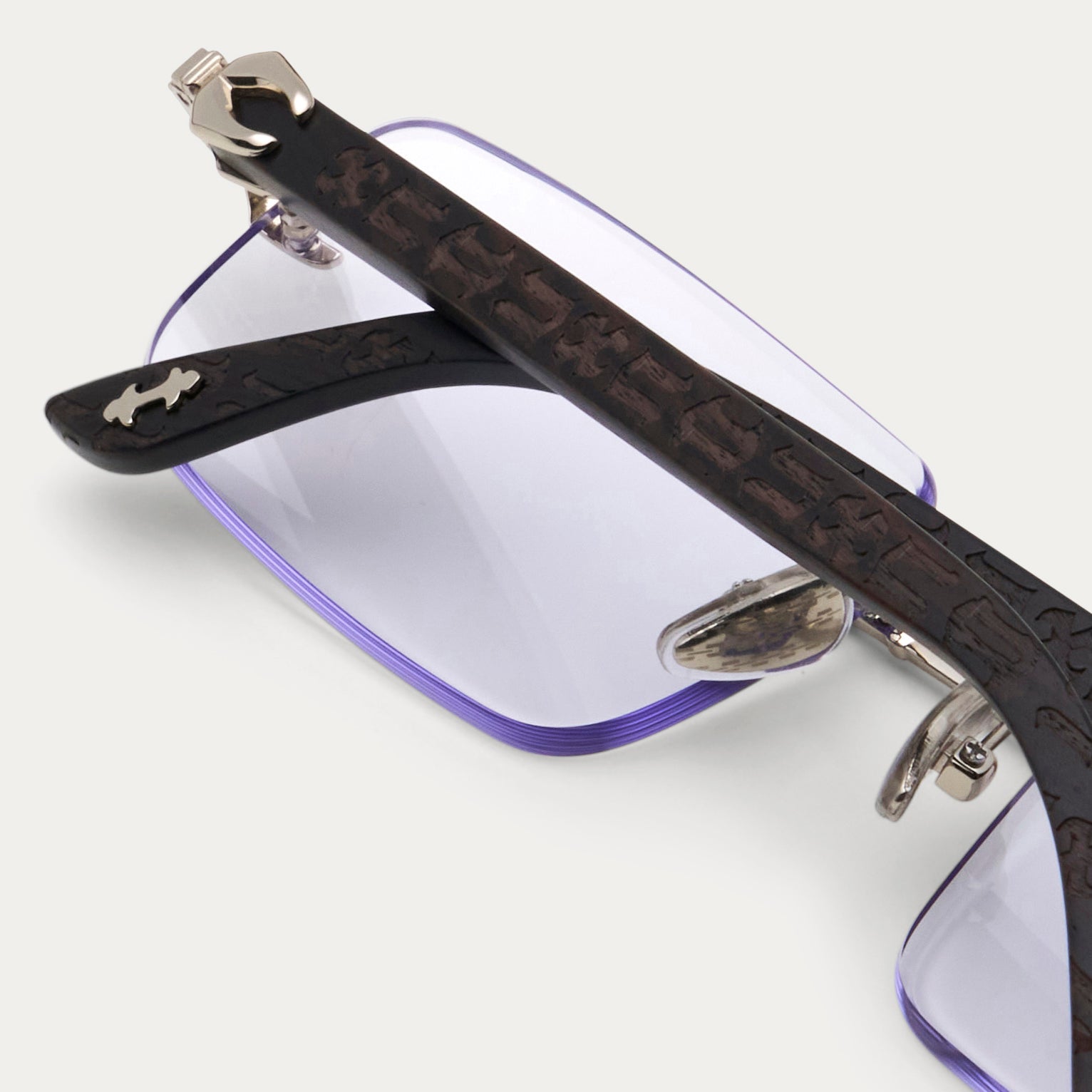A sophisticated rimless frame with 100% genuine wood temples, featuring custom Oro-branded hieroglyphics engraved into the temples. Enhanced with stainless steel hardware and semi-beveled lenses for ultimate clarity and a refined touch of detail.