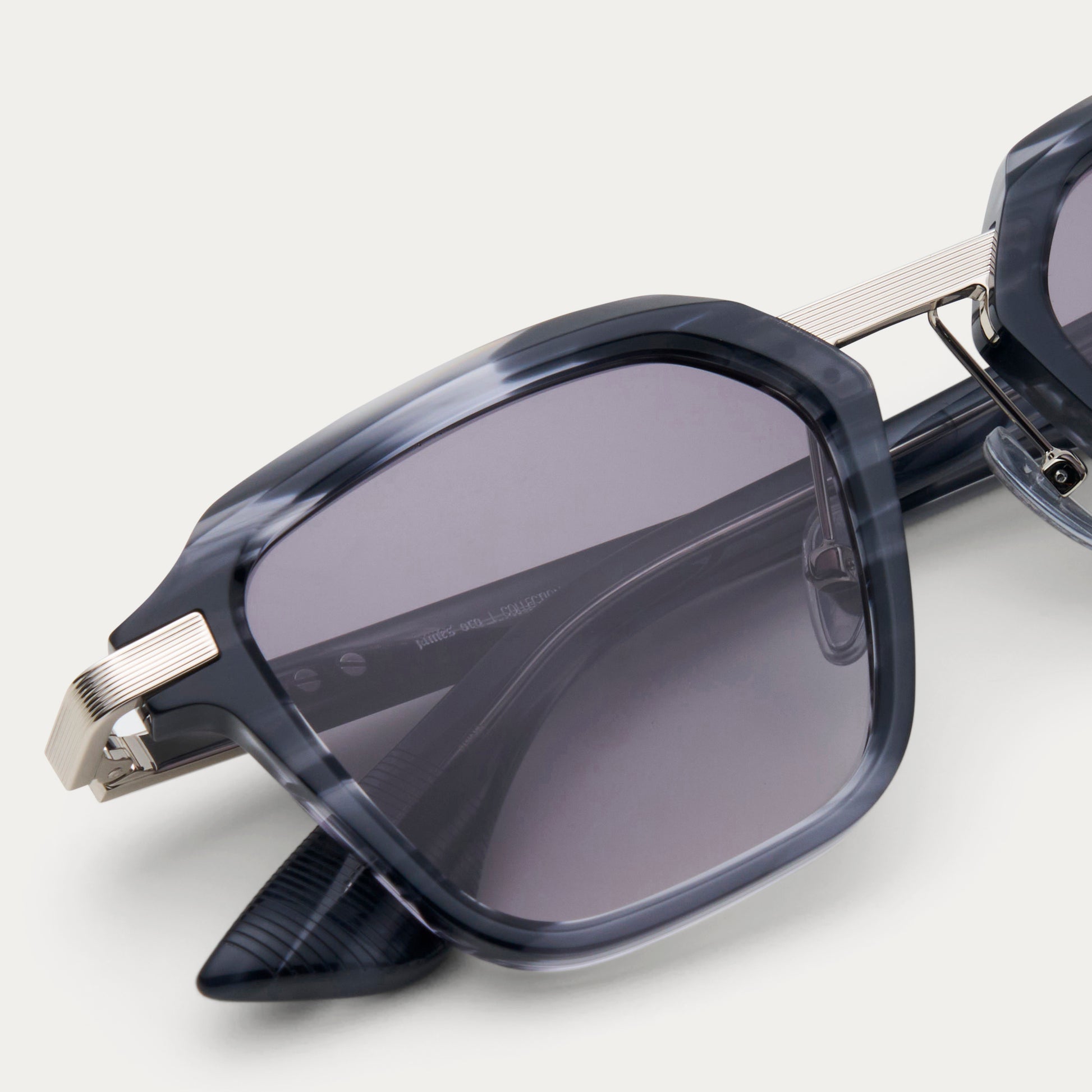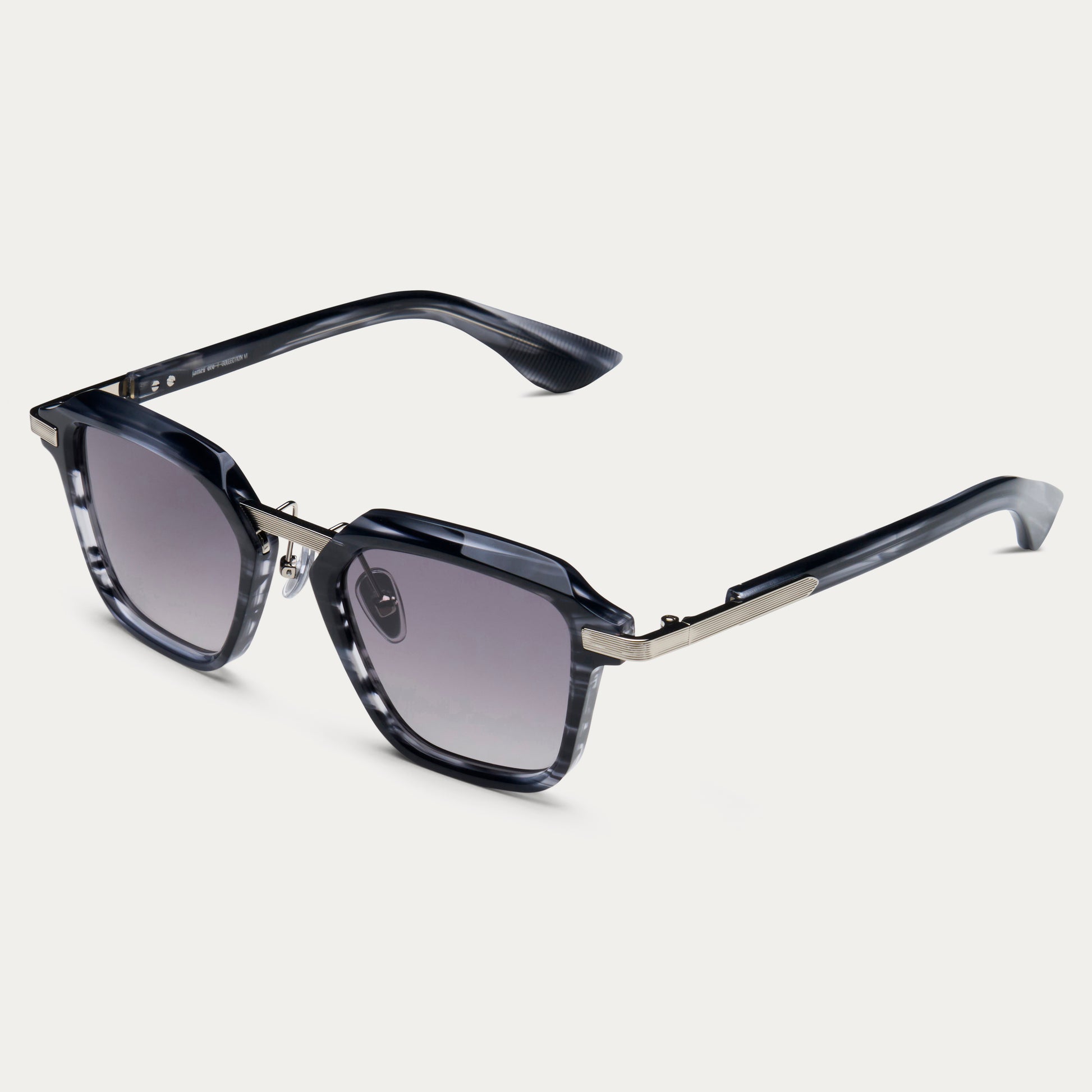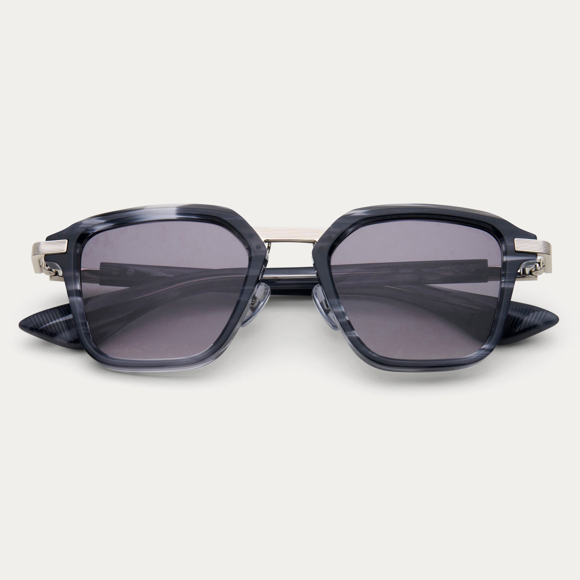 The Savant. A precision-cut square frame in hand-polished acetate with detailed line engravings across the metal temples and bridge hardware. Faceted edges and gradient lenses.