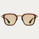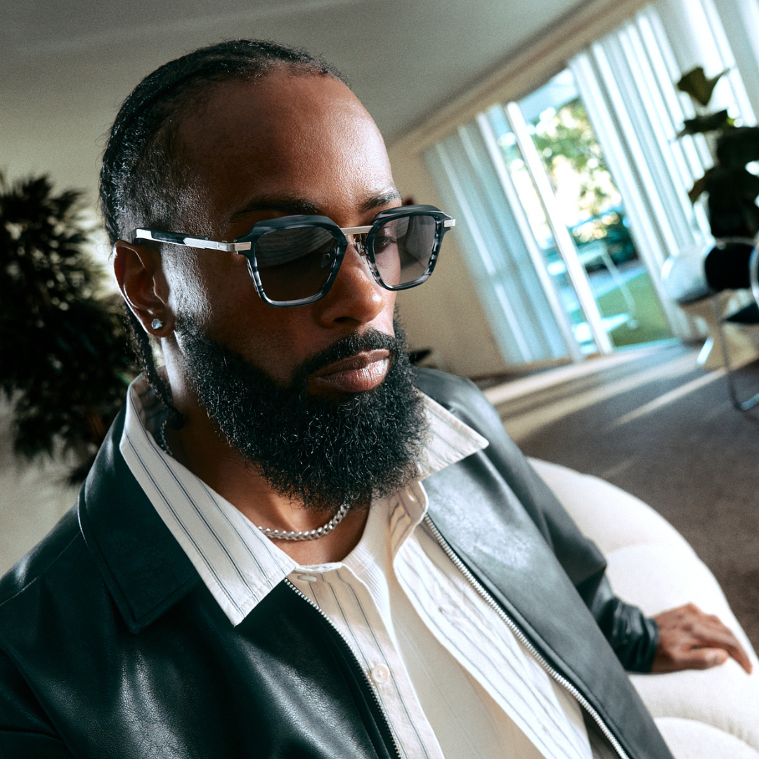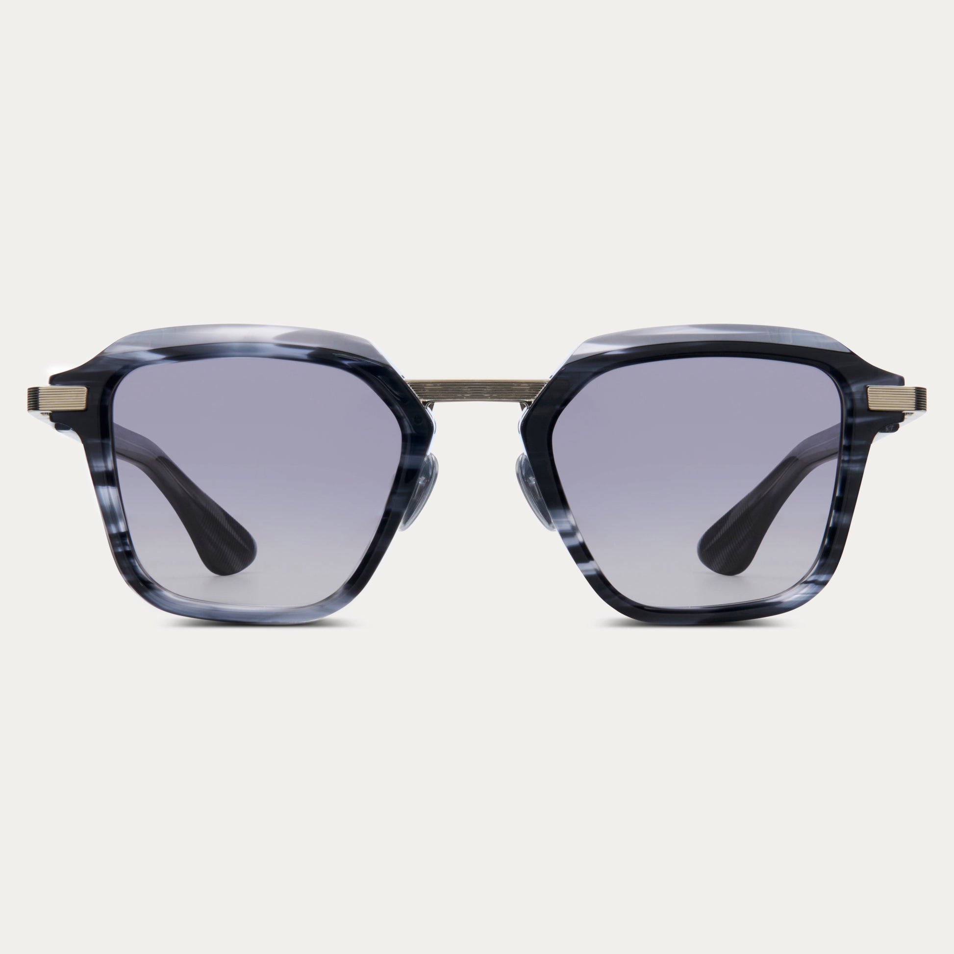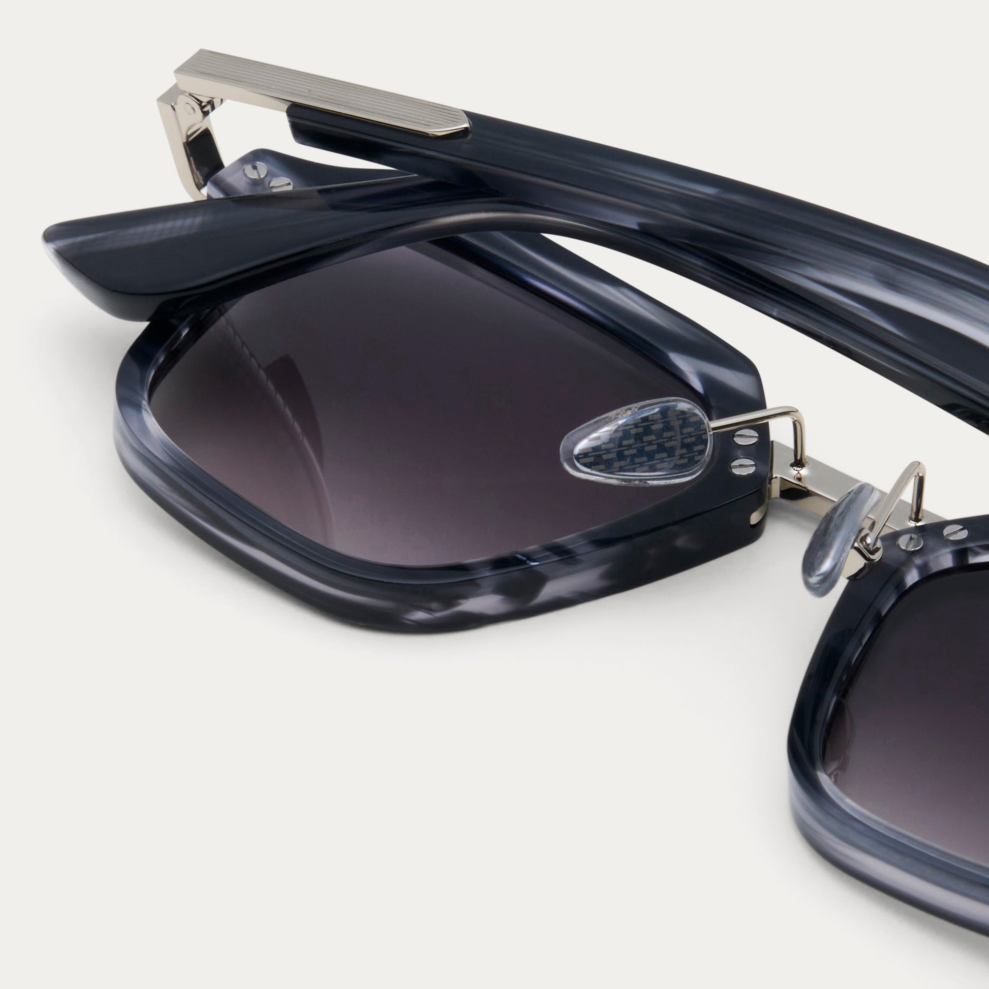 The Savant. A precision-cut square frame in hand-polished acetate with detailed line engravings across the metal temples and bridge hardware. Faceted edges and gradient lenses.
