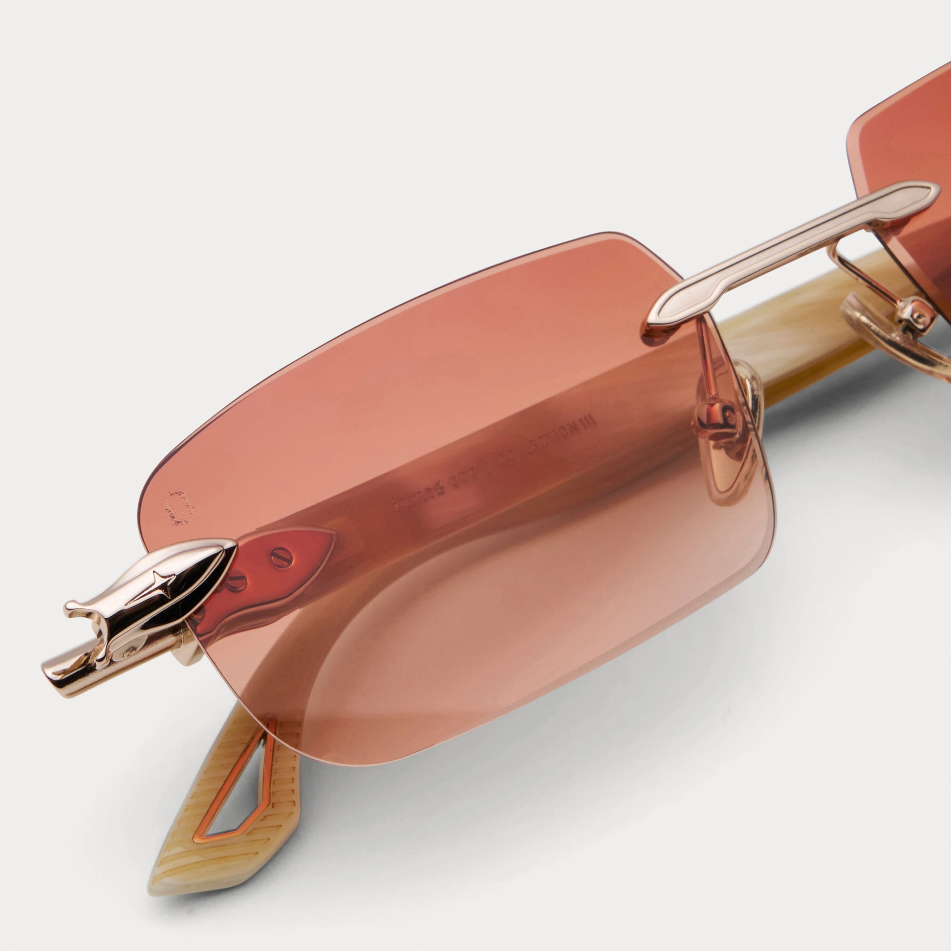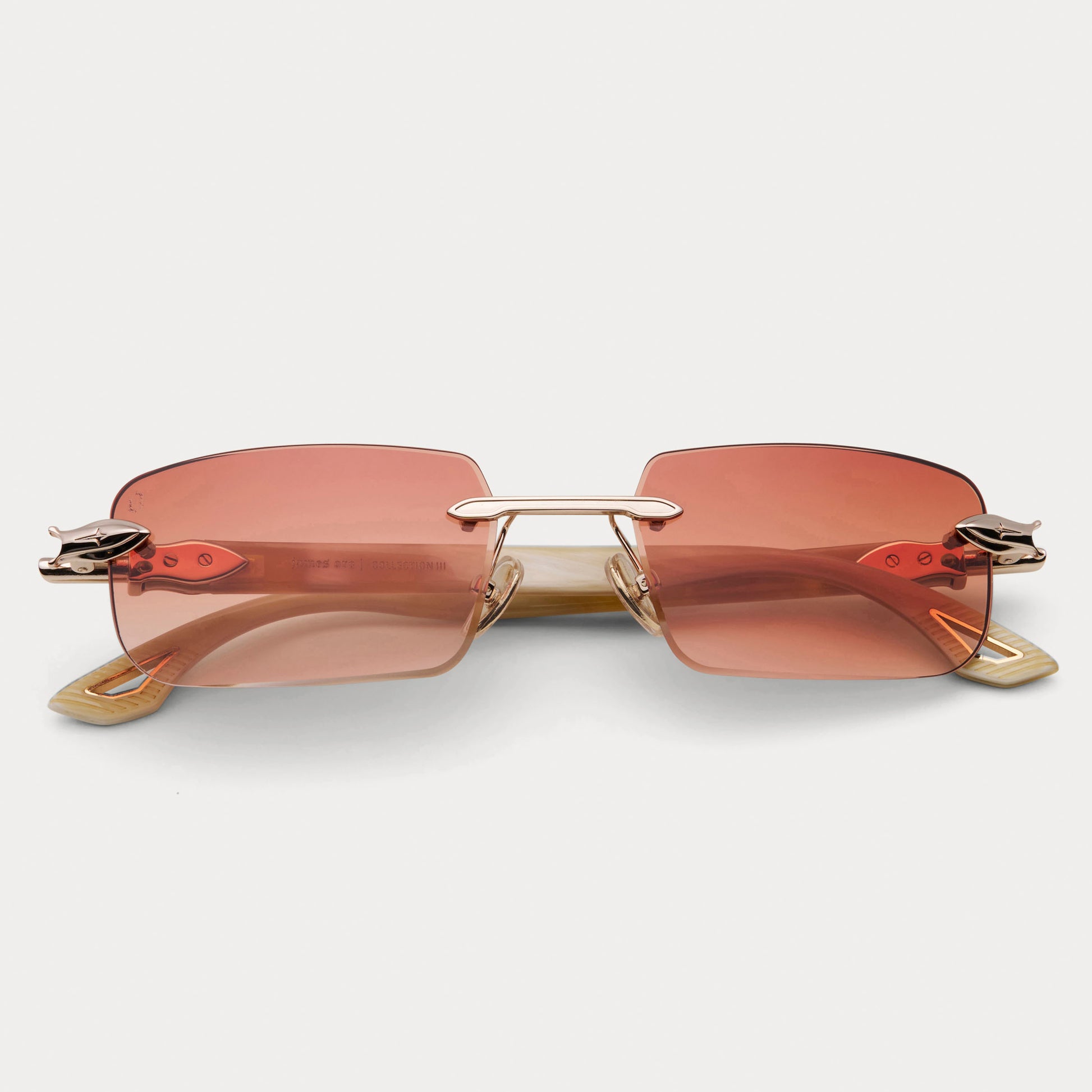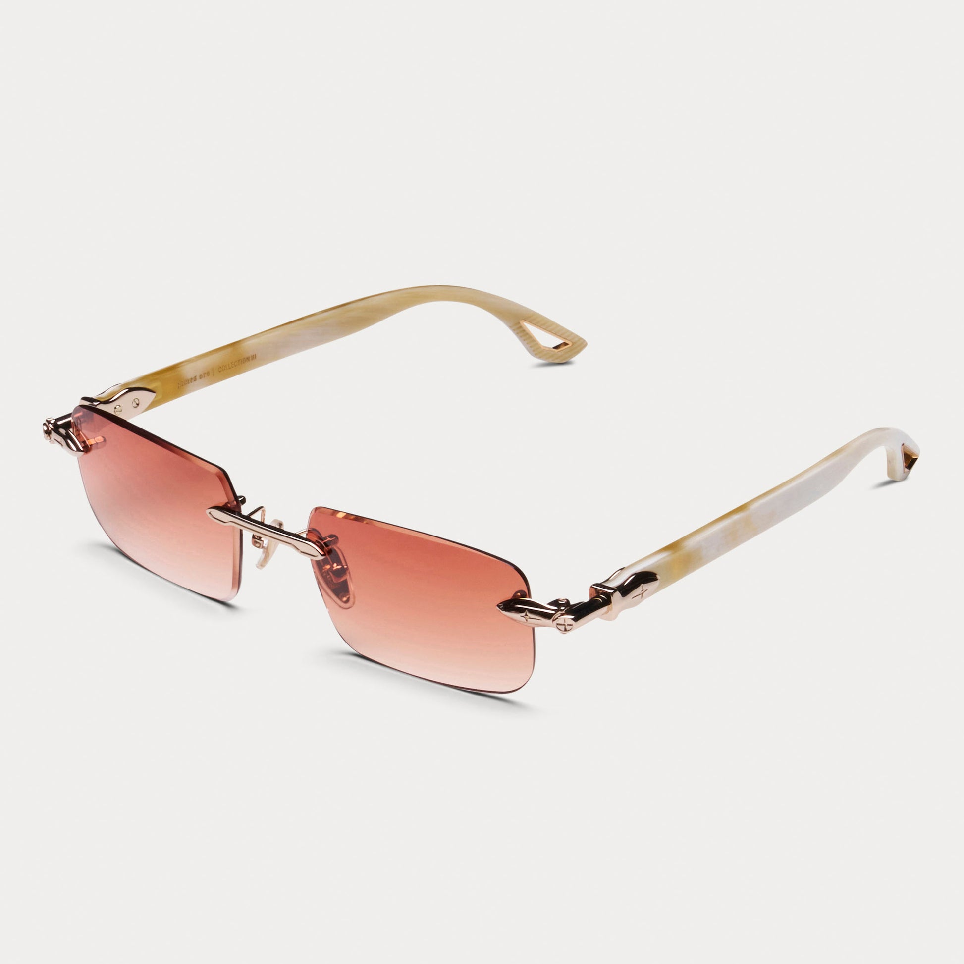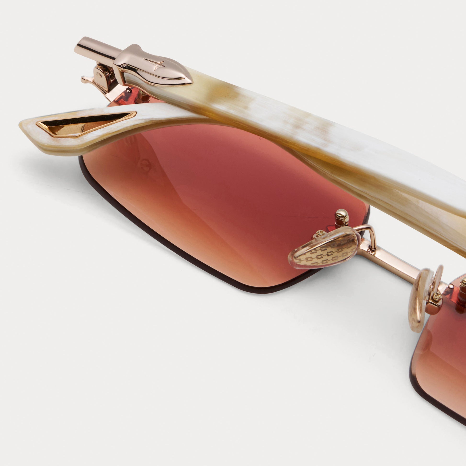 The Javelin blends rare white buffalo horn and light gold metal, with sunset orange lenses. Each frame is unique, lightweight, and striking.