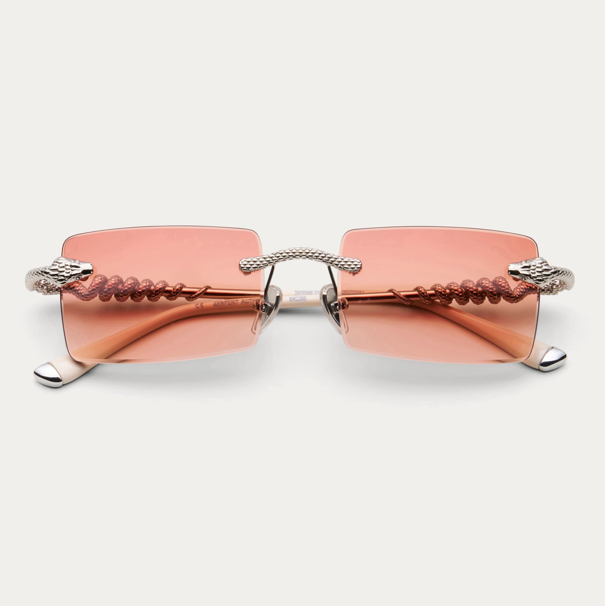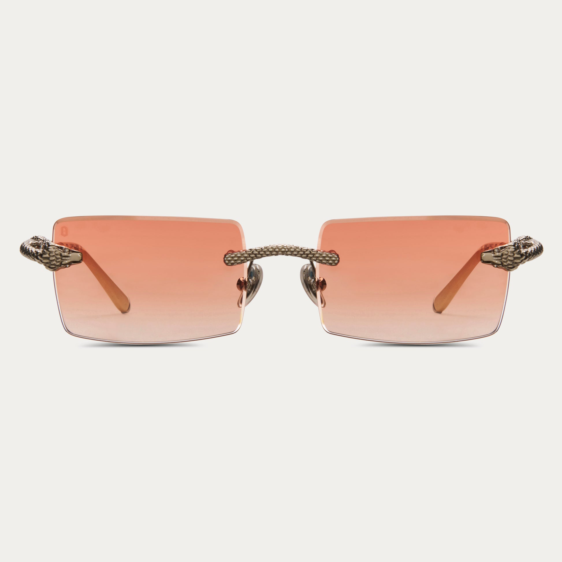 An iconic design from James Oro’s premier collection, the Serpent frames feature a coiling snake around the stainless steel temple, with the snake's head biting the rimless lens. Detailed craftsmanship and white stone eyes complete this statement frame.